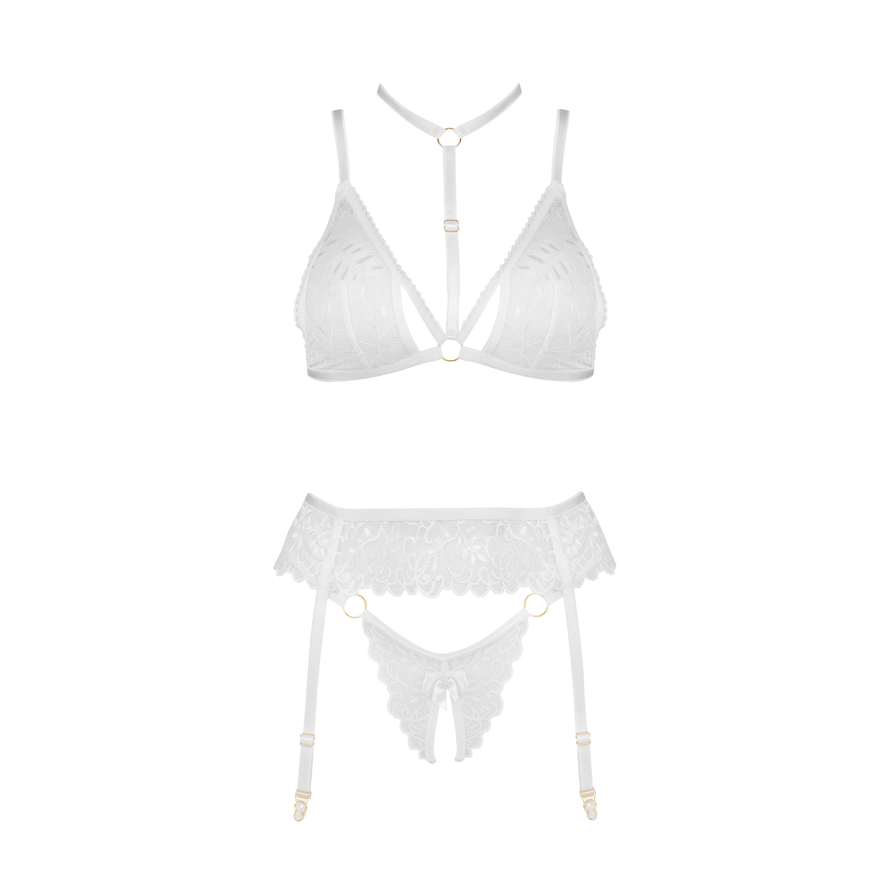 Discover the exceptional lingerie set Noemi set white, consisting of a bra, thong, and garter belt, which will undoubtedly enchant both you and your partner.