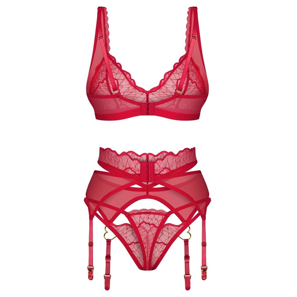 Sensual red for hot fantasies! Obsessive's Cupide Desir 3-piece set contains a bra, a garter belt and a string.