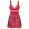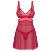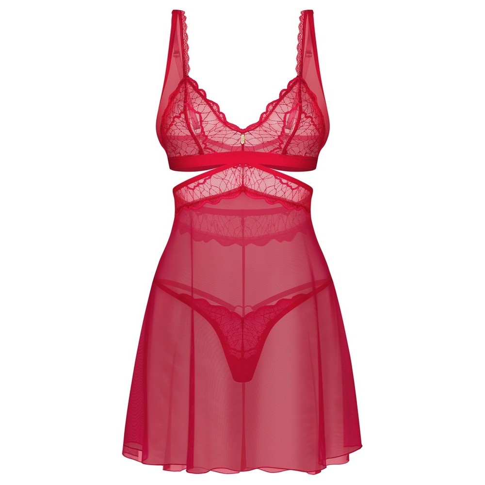 The Cupide Desir set from Obsessive contains a flared babydoll and string made out of sensual red material with gold-coloured details. The set is in a seductive, transparent delicate lace look. The set is soft & stretchy for a very comfortable fit. With a discreet decorative detail between the wireless cups. The straps can be adjusted to fit. There is a hook fastener at the back to adjust the babydoll. The beautiful lace string has a decorative heart over the buttocks.