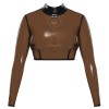 The crop top from LateX is made out of natural latex (glued) in a smoky transparent colour. The top has long sleeves and a large decorative metal ring at the front underneath the stylish stand-up collar. There is a full-length zip at the back which makes it easy to put on and take off.