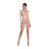 A sensual and elegant dress, with seductive mesh, deep cut-outs on the shoulders and long sleeves, in a perfect balance between daring and sophistication.
