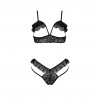 The open-cup bra offers a provocative touch, with a delicate tulle and black lace design that wraps around the body with unrivalled softness. The thong complements the set with attractive details, following the same line of elegance and seduction.