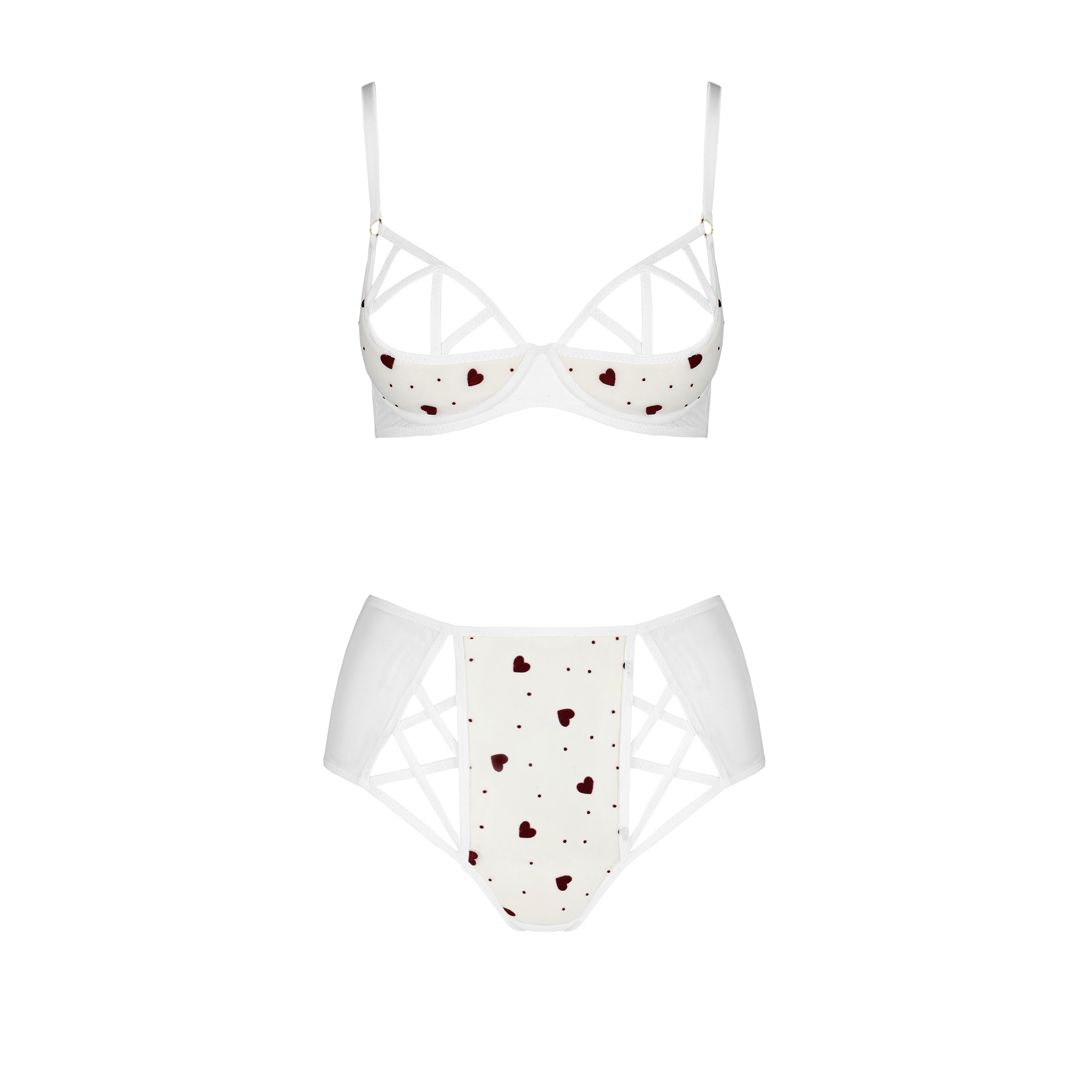 The bra, with reinforced underwires and strategic cut-outs, offers an ideal fit and accentuates your curves with sophistication. The thong, made from delicate tulle with a romantic heart pattern, adds an irresistible touch to the outfit.