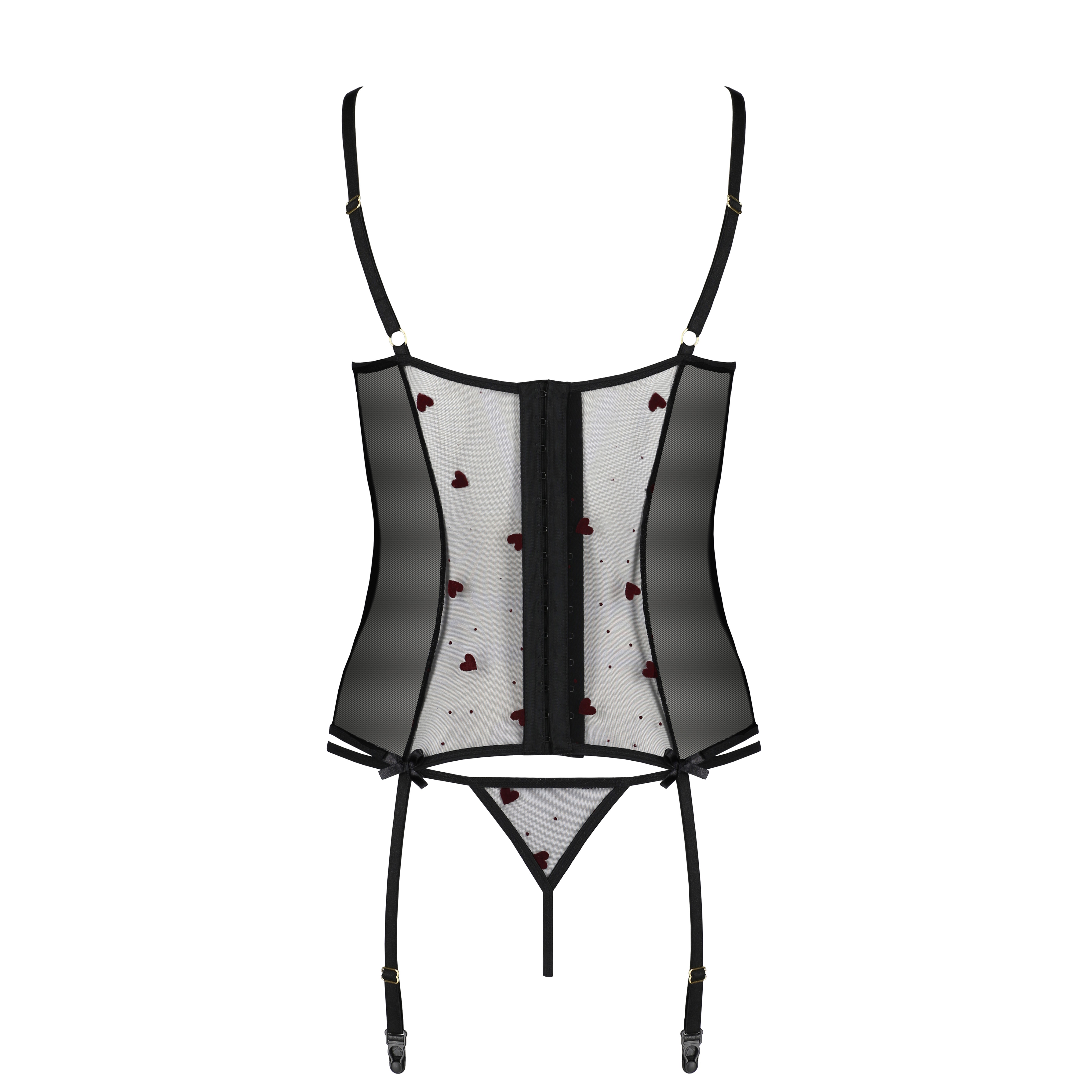 The thong, matching the heart pattern and with an opening between the legs, adds an extra touch of sensuality to the garment.