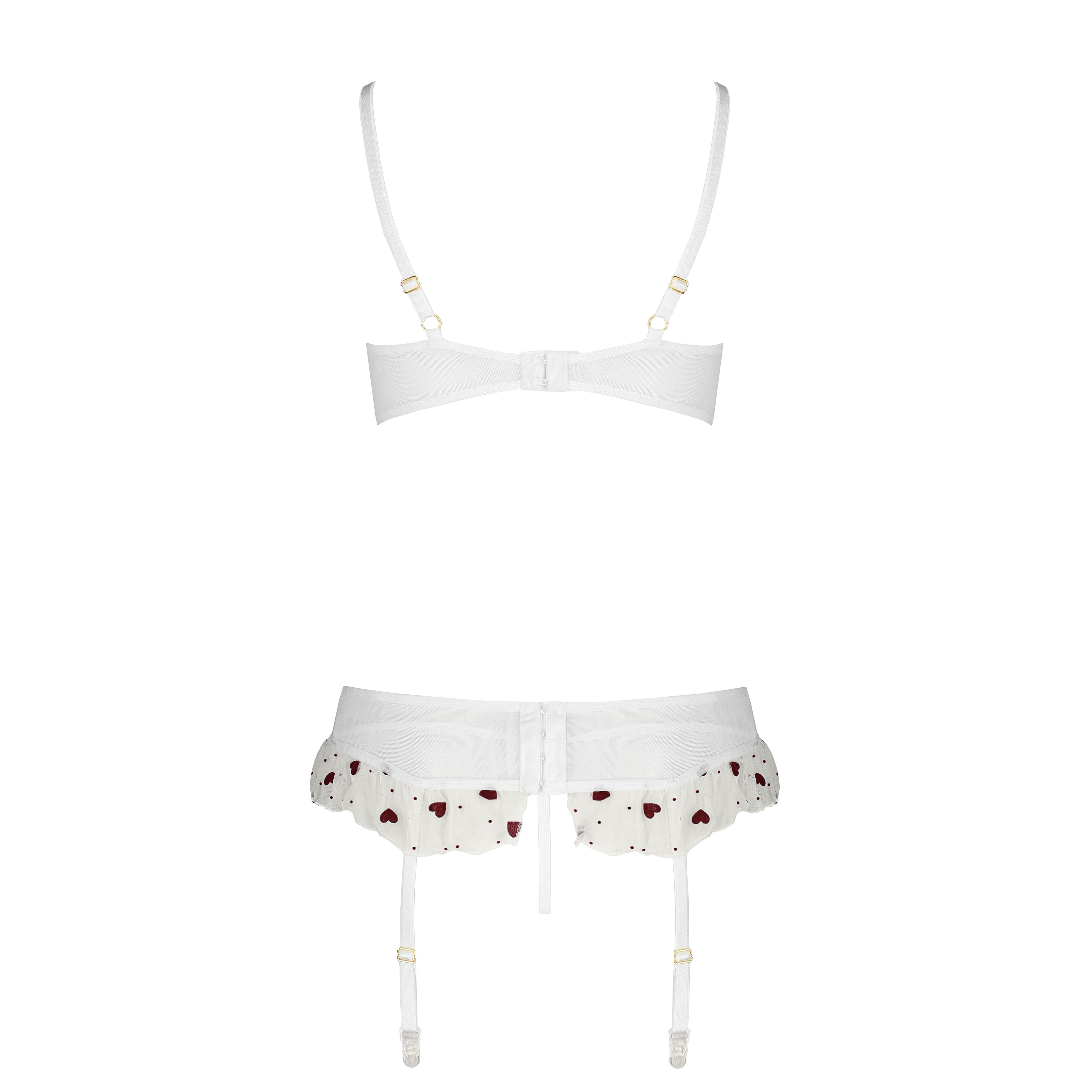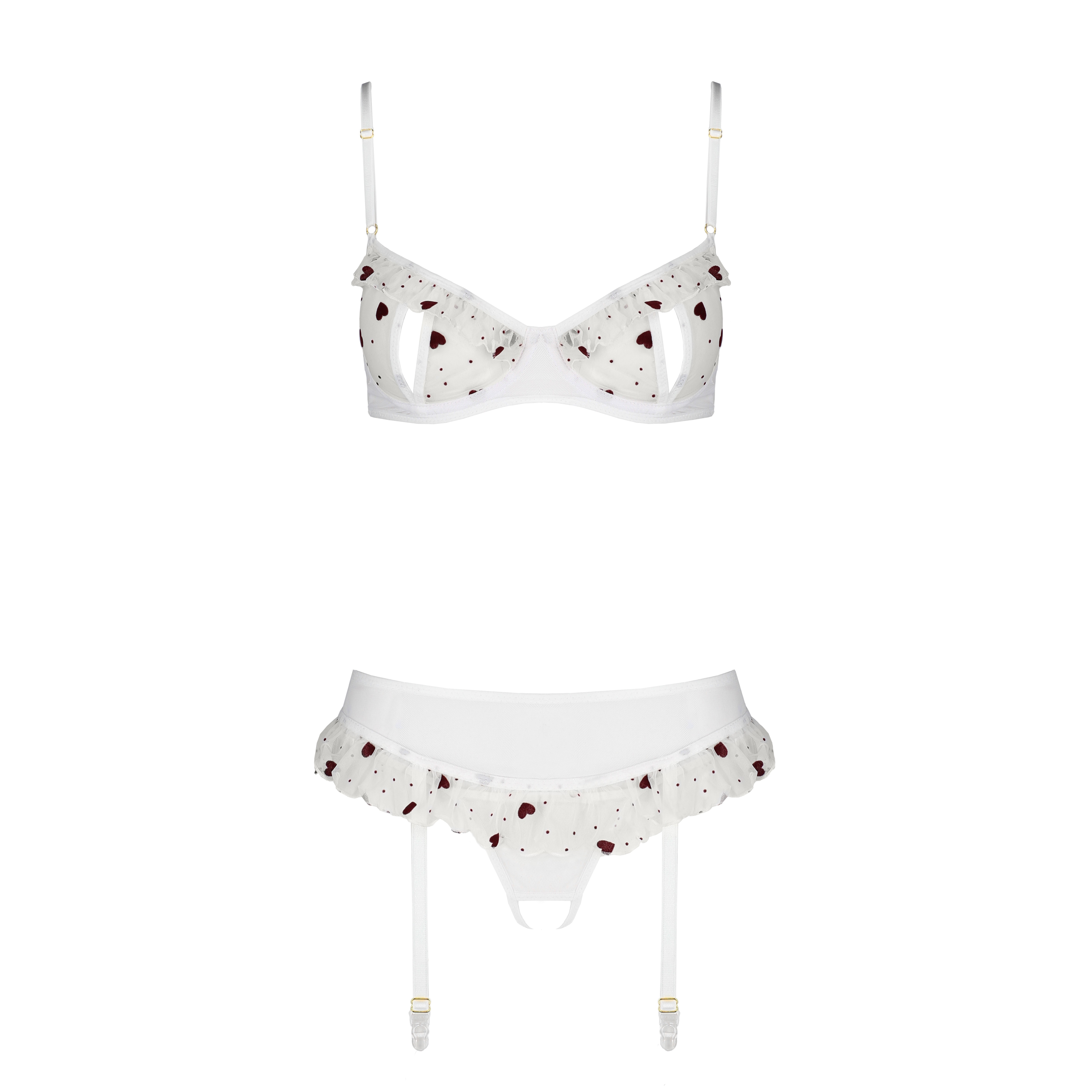 The Lovelia 3-piece set in heart-patterned tulle includes a bra with sensual openings, a delicate garter belt and an open thong, creating a romantic and irresistible look.