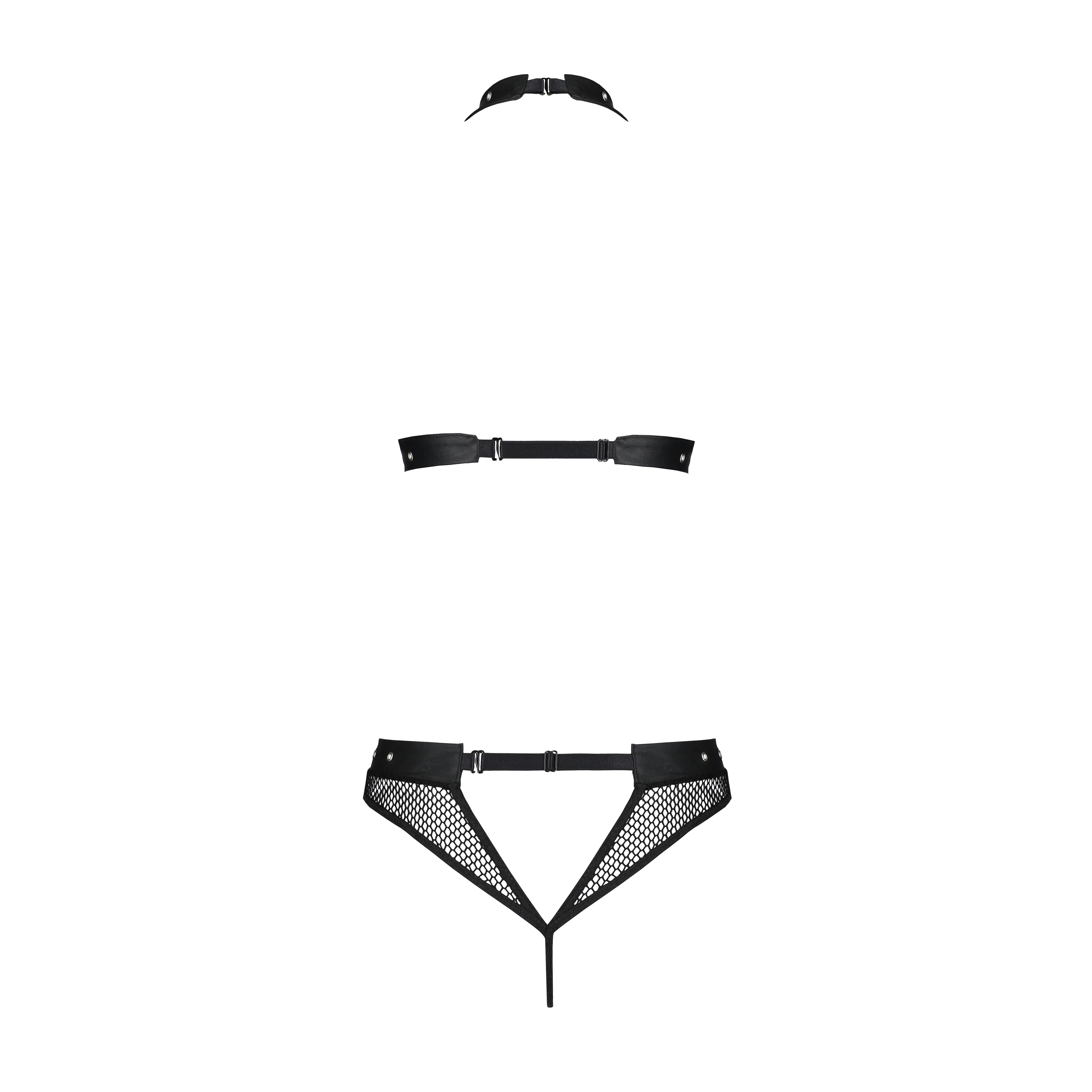 With a delicate mesh that hugs the curves of the body, bold leather inserts and decorative press studs, this set stands out for its sophisticated design.