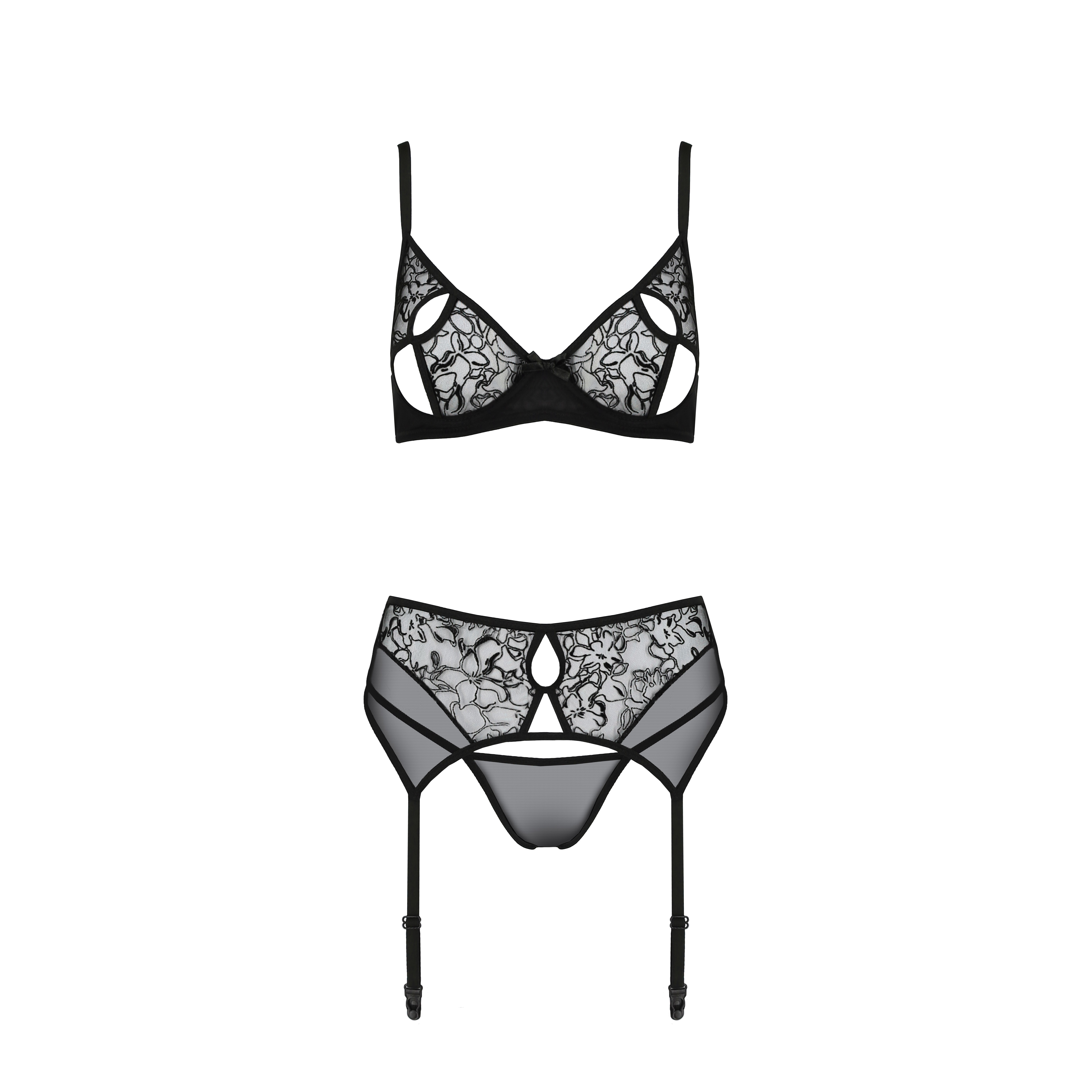The bra, with cut-outs and cups reinforced with whalebone, offers support and defines the silhouette in an elegant way, while the adjustable straps provide personalised comfort. The lace thong and garter belt add a final touch of sophistication and seduction.