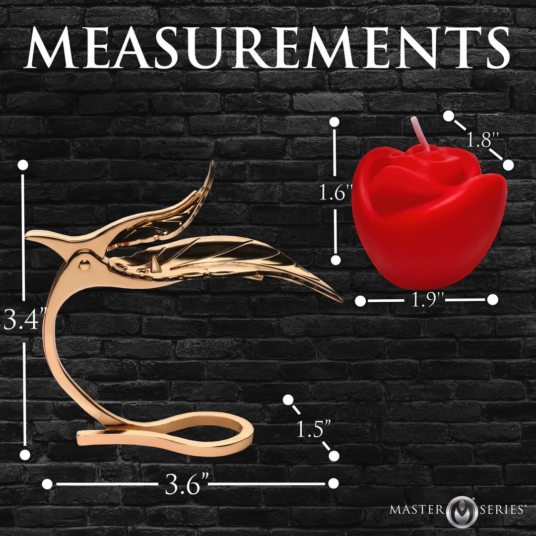 This elegant pink candle holder features golden leaves and pins that hold the candle in place. As the wax melts, it accumulates and can be poured from the golden leaf, creating a stunning visual effect before stimulating the senses. Made from nickel-free zinc alloy, it is designed to withstand the high temperatures of the candle as it burns. Enjoy the included red rose — place it right on top of the pin, creating the effect of a flower blooming from a golden stem. The soy candle has a low melting point and is gentler on the skin than other traditional candles. When this candle is finished, you can replace it with more Burning Passion pink candles (AH229). Soy candles are easy to clean and do not leave stains.