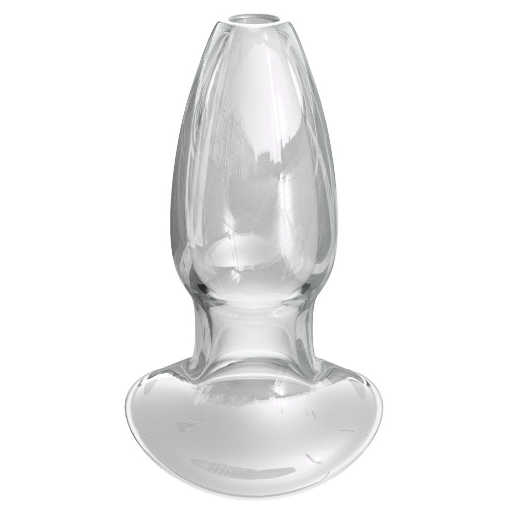 Plug anal hueco con base de seguridad que impide una inserción excesiva. Perfecto para enemas refrescantes y juegos sensoriales con un mini vibrador. Presenta un diseño exclusivo y transparente en vidrio borosilicato, resistente e higiénico.