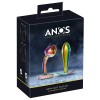 Set de plugs anales metálicos en colores arcoíris de ANOS, compuesto por 2 plugs metálicos con acabado brillante multicolor. Uno de los modelos presenta un diseño cónico clásico y recto, mientras que el otro es ligeramente curvado, con una punta saliente en forma de punto P, ideal para una estimulación dirigida.