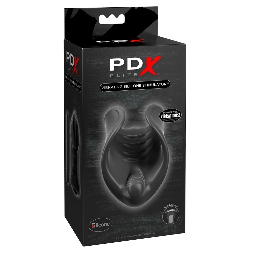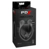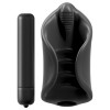 Masturbador negro, flexible, con vibración y textura interior estimulante y pronunciada.