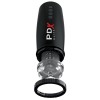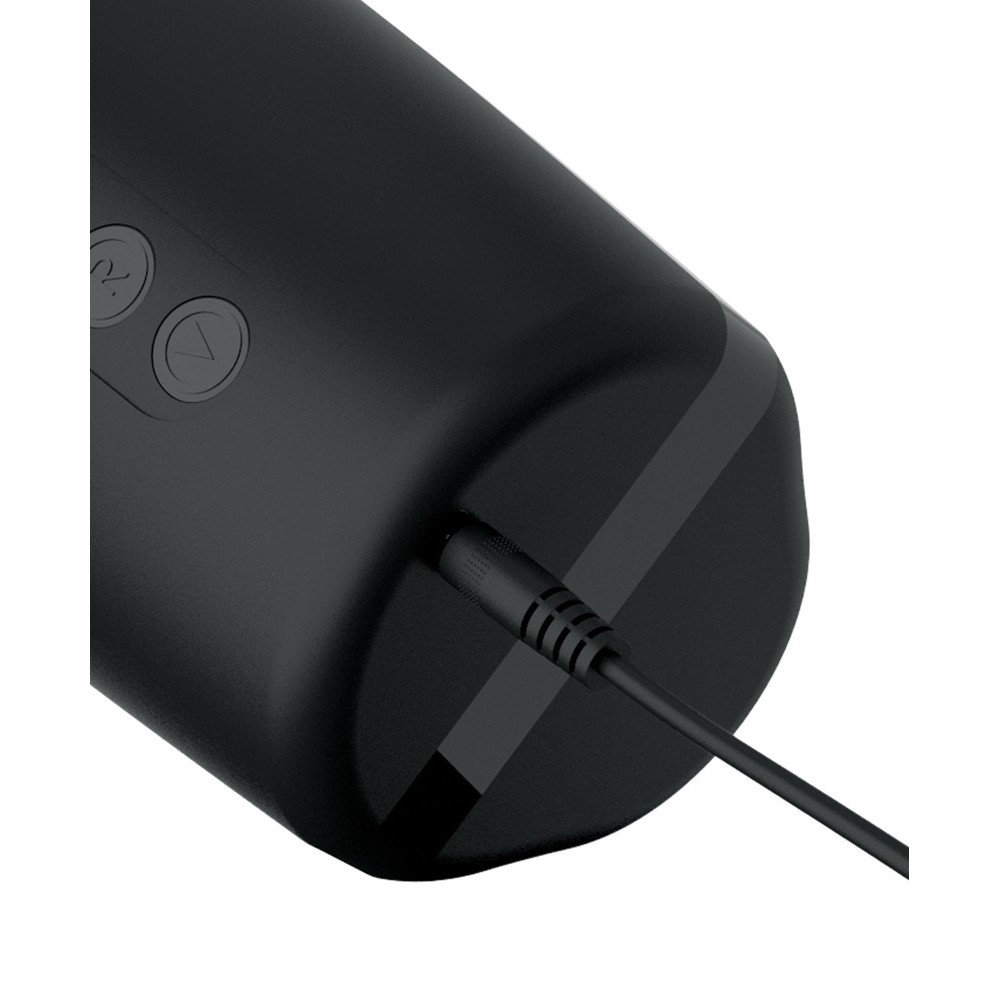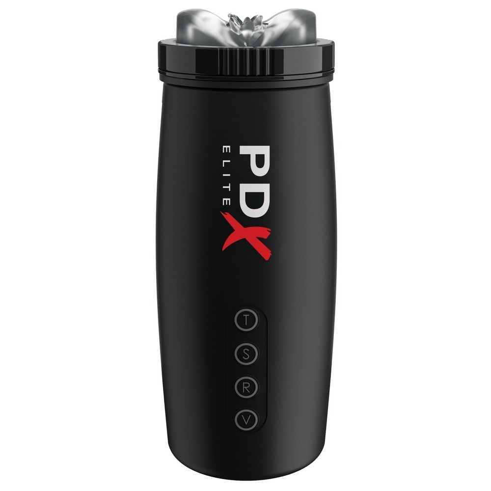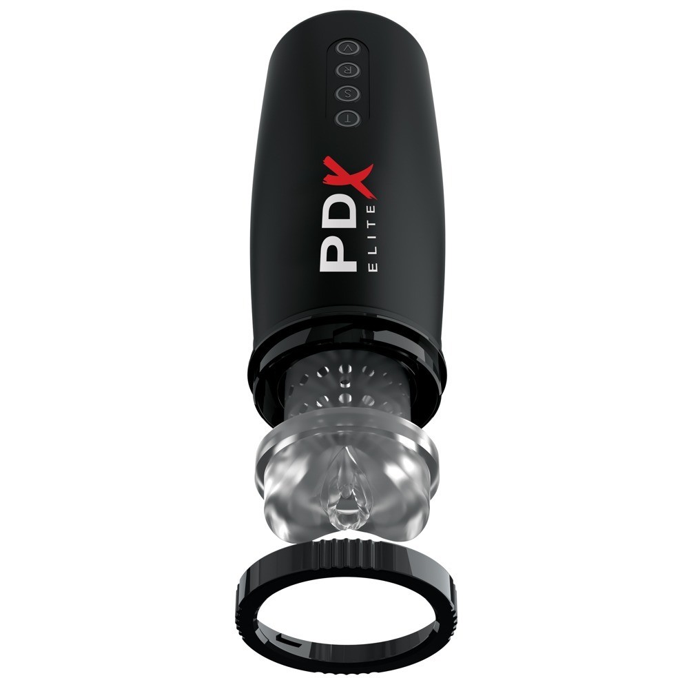 Masturbador negro con dos velocidades de impulso, cinco modos de vibración y tres modos de succión, controlables de forma independiente. El túnel del placer está estriado y punteado para una estimulación intensa.