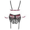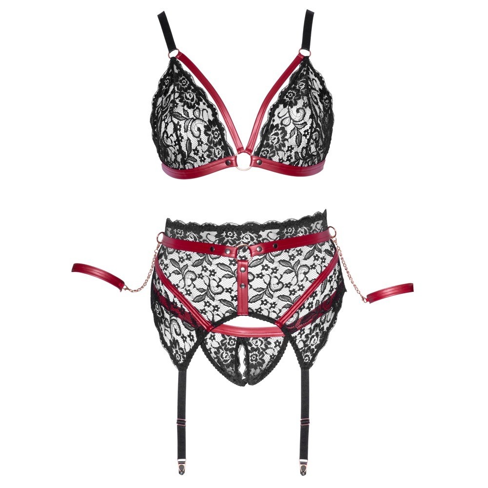 Sujetador sin aros, liguero y tanga sin entrepierna de Cottelli BONDAGE, en encaje elástico negro con extravagantes detalles en material mate rojo oscuro. El conjunto incluye además elementos decorativos en tono oro rosa y tachuelas atrevidas. El sujetador tiene tirantes ligeramente más anchos y ajustables, así como cierre de gancho en la espalda. Las presillas para los brazos incluidas se pueden fijar a las anillas laterales del liguero mediante ganchos a presión. El liguero tiene un cierre de gancho en la espalda y tiras ajustables. El tanga, totalmente abierto en la entrepierna, da el toque final a este provocativo trío.