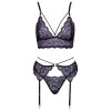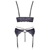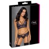 Conjunto de Cottelli LINGERIE compuesto por sujetador, liguero y tanga, totalmente en encaje floral bicolor. El encaje es suave y elástico, lo que garantiza la máxima comodidad. El bralette no tiene cierre y presenta tiras elásticas cruzadas entre las copas sin aros. El liguero destaca por las tiras elásticas decorativas que envuelven la cintura. Los tirantes del sujetador y las ligas son ajustables. El delicado cordón de encaje añade el toque final a este encantador conjunto.