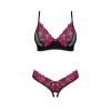 Conjunto Rosenty, de Obsessive, compuesto por sujetador con aros y tanga sin entrepierna. Suave tejido negro combinado con fino encaje rosa, creando una elegante mezcla con tejido elástico opaco. El sujetador presenta un delicado elemento decorativo entre las copas, armazón y cierre de gancho ajustable en la espalda, mientras que los tirantes son regulables para un ajuste perfecto. El tanga seduce con su cintura de encaje y su provocativa abertura en la entrepierna.
