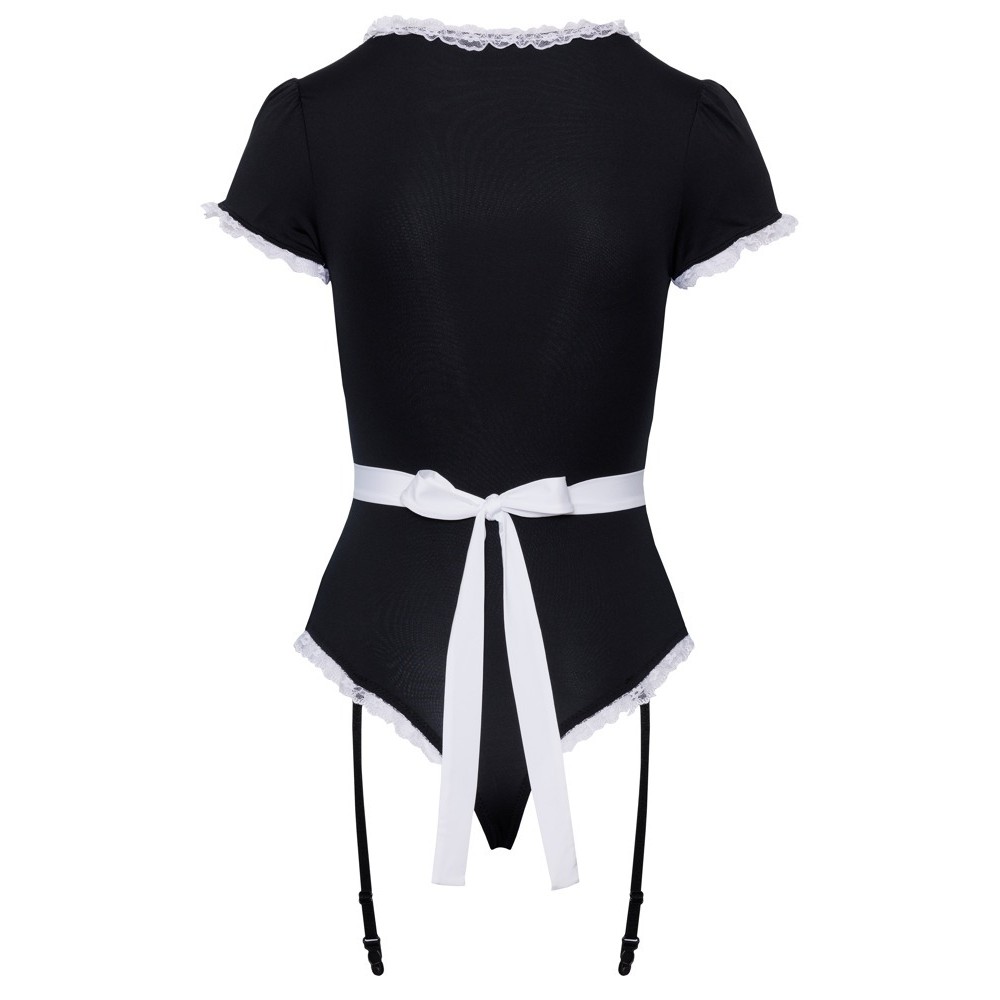 Este disfraz de criada de Cottelli COSTUMES incluye un body con ligas y un delantal a juego. El body negro, suave y elástico, destaca por los elegantes volantes de encaje blanco alrededor del generoso escote, en las mangas cortas y en las aberturas de las piernas. Dos pequeños botones blancos decorativos en la parte delantera completan el clásico look de sirvienta. La entrepierna cuenta con prácticos cierres. Las ligas son ajustables y totalmente extraíbles. El delantal blanco, con volantes de encaje, se ata en la espalda para un ajuste perfecto.