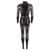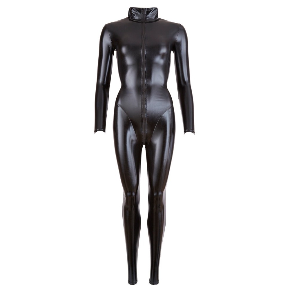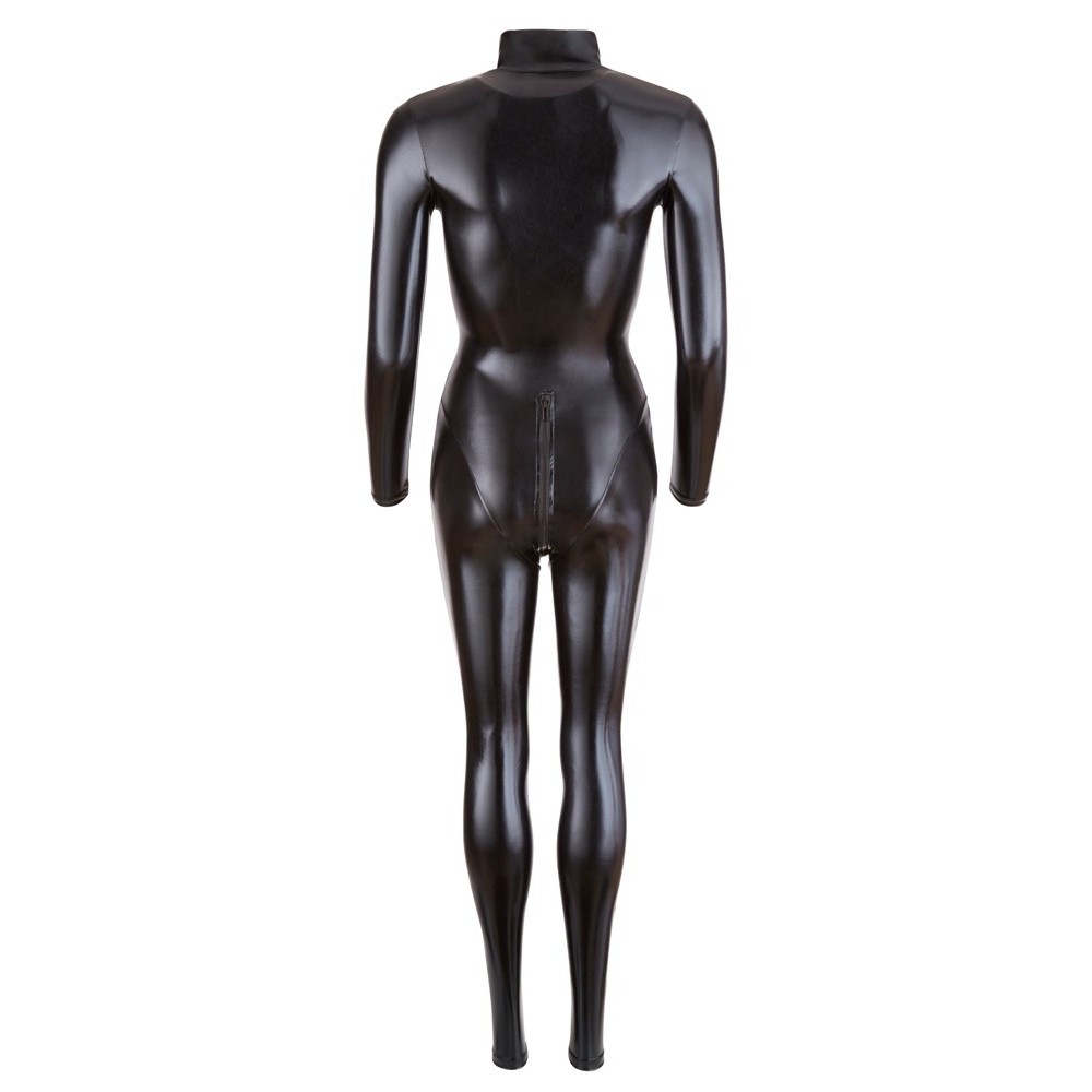 Este mono negro, con mangas y piernas largas y cuello alto, envuelve totalmente el cuerpo sin perder sensualidad. El material elástico se ajusta perfectamente, realzando las curvas de forma elegante. La cremallera larga de doble sentido comienza en el cuello, recorre la entrepierna y termina en la parte superior de las nalgas, lo que permite una mayor versatilidad y un toque atrevido.