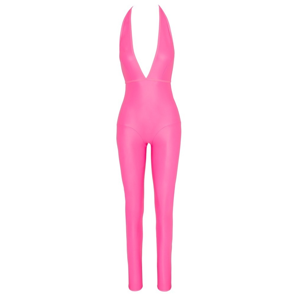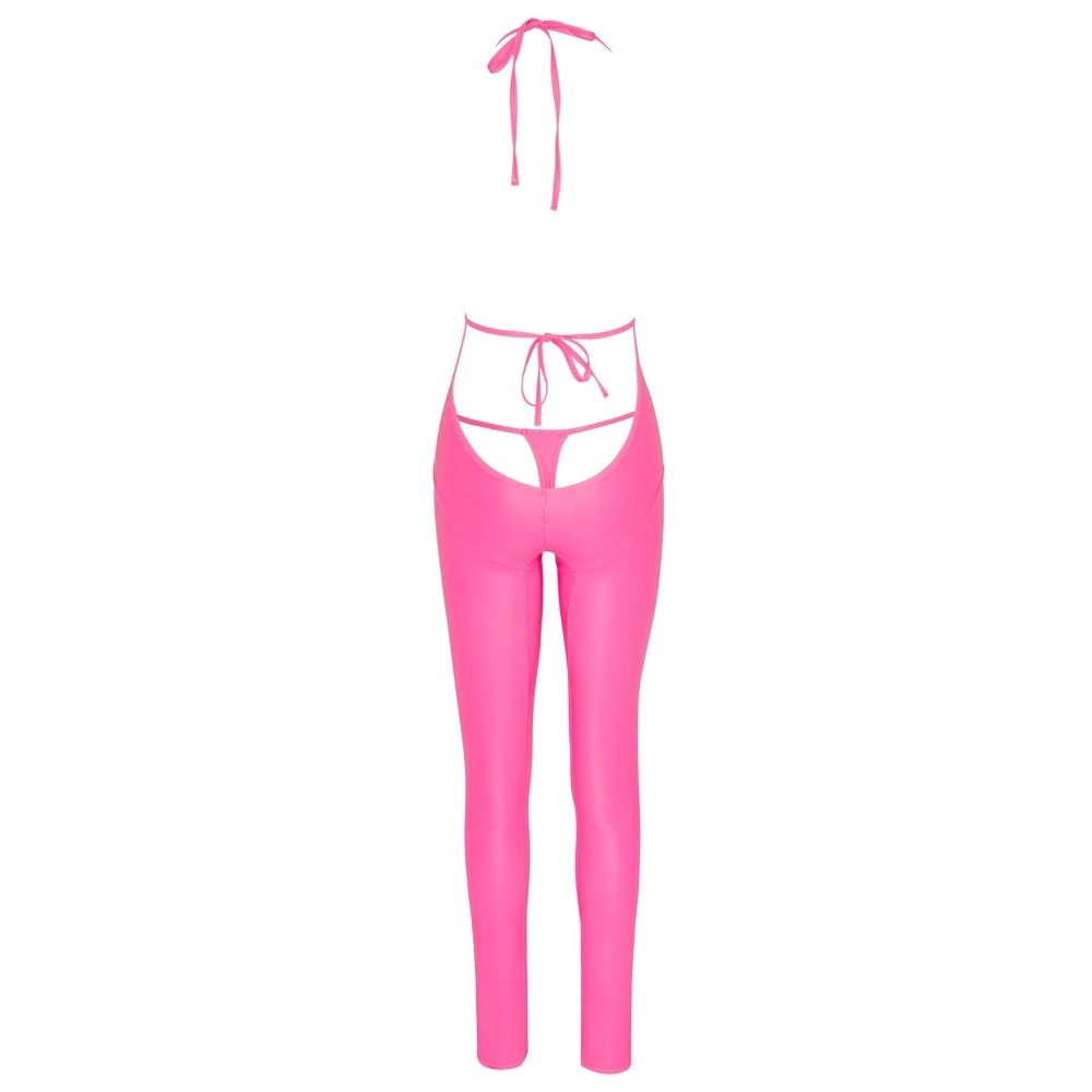Mono con cordón de Cottelli PARTY, confeccionado en material rosa neón con acabado brillante mate que atrae todas las miradas. De piernas largas y ajustadas, presenta un escote profundo que termina en la zona del ombligo, con un lazo en el centro. La espalda queda prácticamente al descubierto hasta la zona de las nalgas, excepto por una banda en la cintura que se ata por detrás. El material suave y elástico garantiza un ajuste perfecto y cómodo.