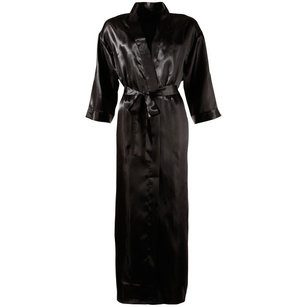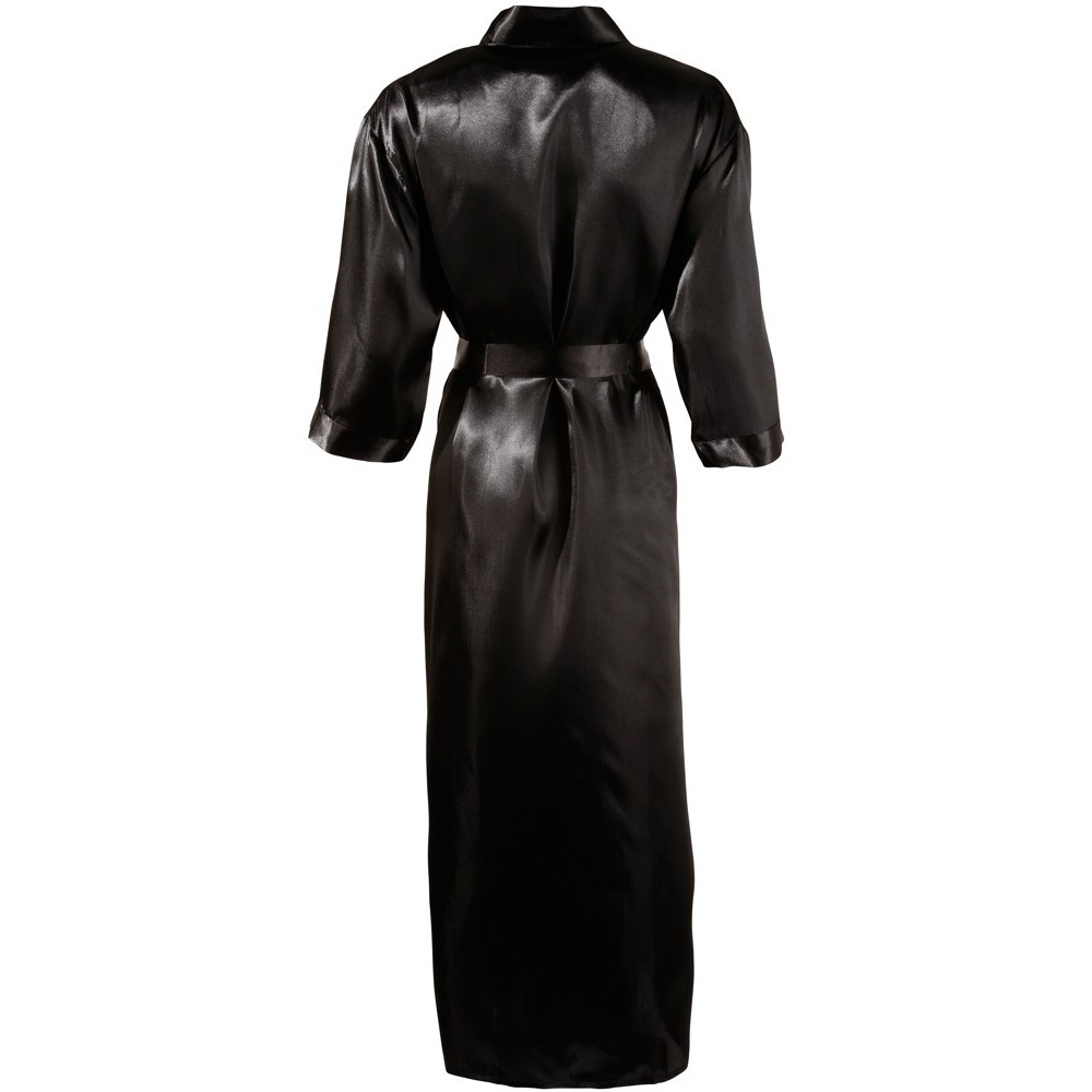 Bata larga negra, confeccionada en tejido brillante, suave y fluido, con tacto satinado, ideal también para realzar las siluetas más curvilíneas. Incluye cinturón para atar a la cintura. Sin bolsillos.