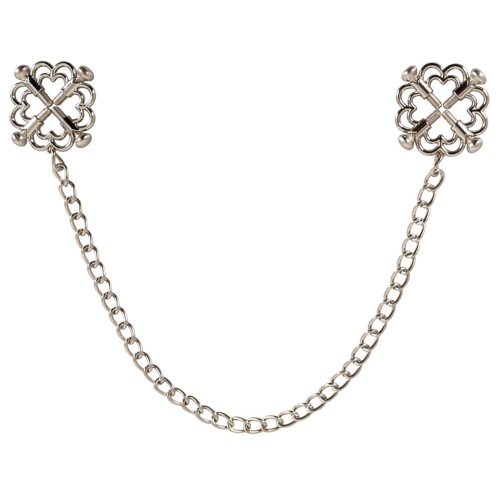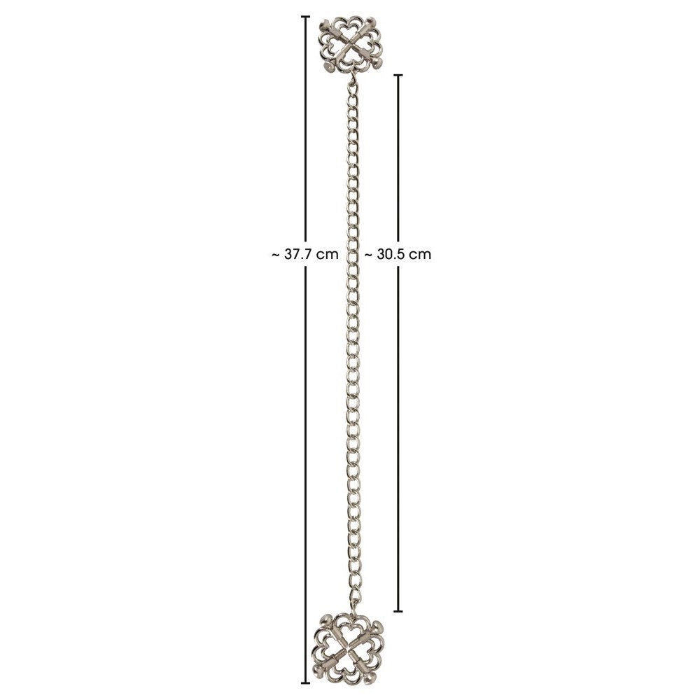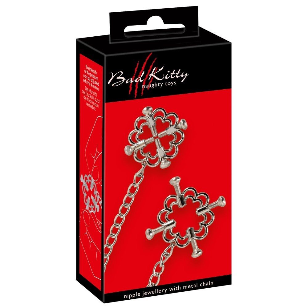 Las joyas para pezones con cadena metálica de Bad Kitty están compuestas por dos pinzas firmemente unidas por una cadena. Estas joyas para el pecho están fabricadas íntegramente en acero inoxidable. Las elegantes pinzas mantienen los pezones en su sitio mediante cuatro tornillos de ajuste, lo que permite variar la presión de suave a firme. La cadena añade un agradable tirón, haciendo que la experiencia sea tan seductora como el aspecto.
