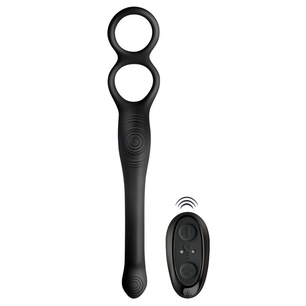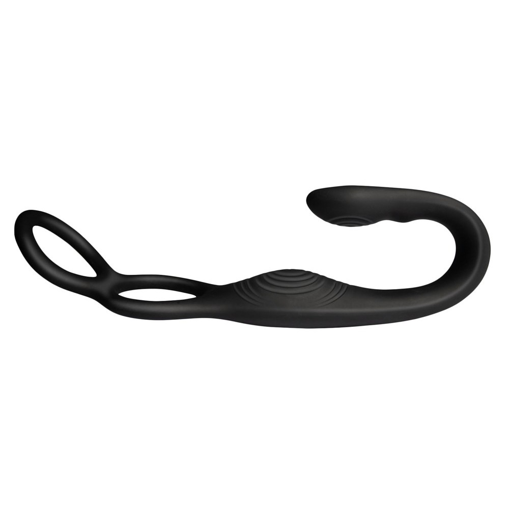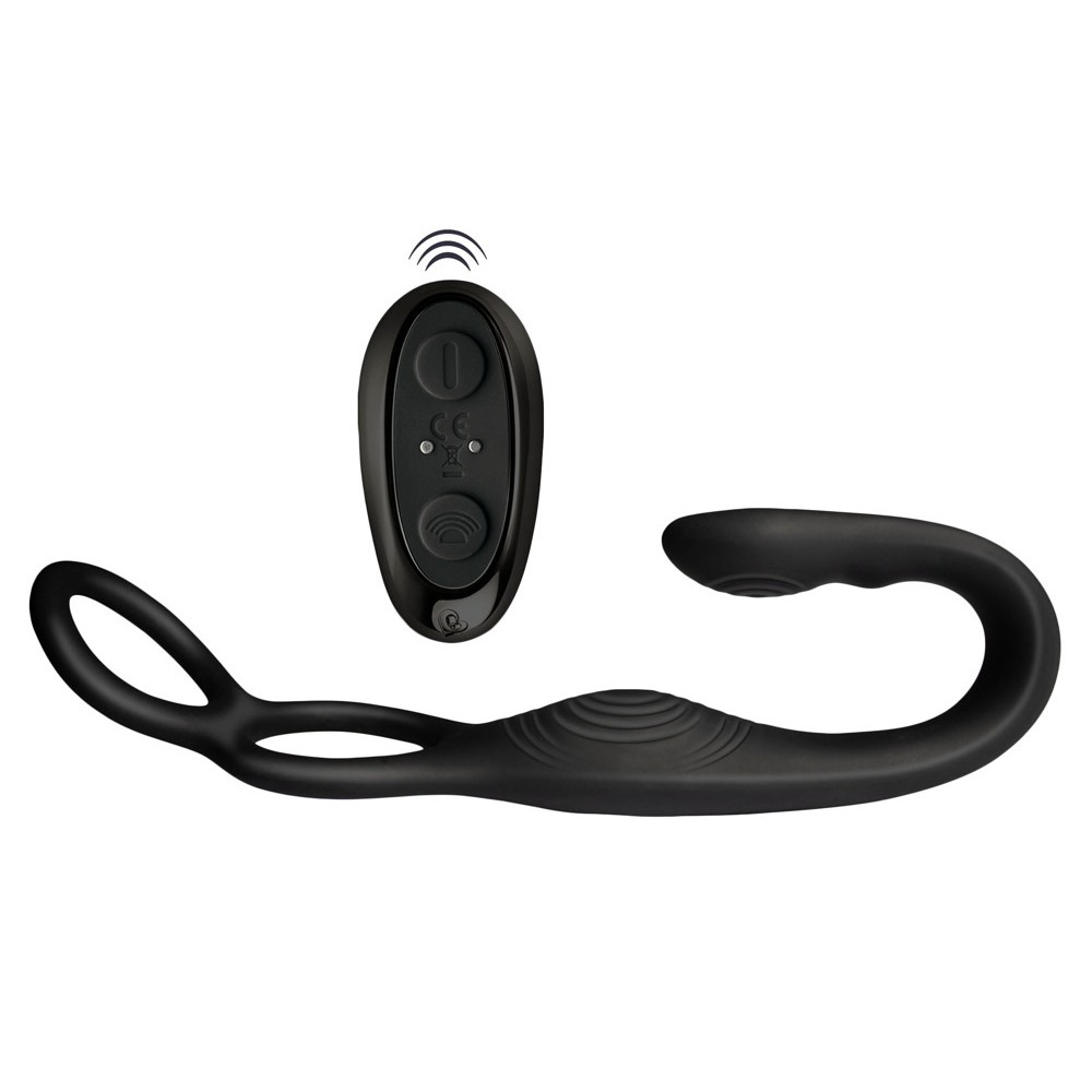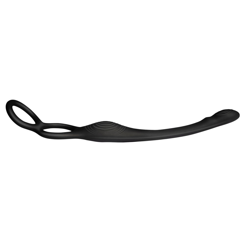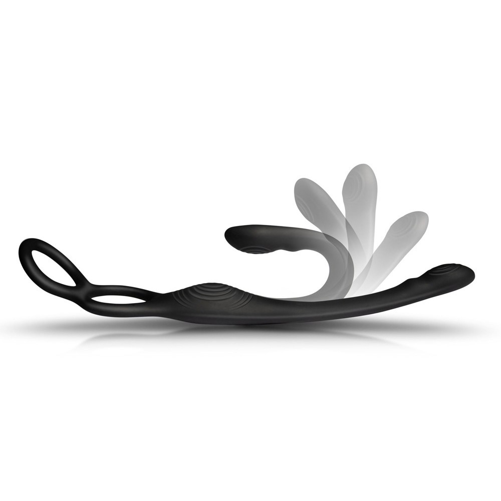 El estimulador de próstata y los anillos flexibles de apoyo a la erección están conectados por una barra vibratoria de estimulación del perineo, que evita que el estimulador se deslice demasiado hacia dentro y lo mantiene en la posición ideal. Se puede usar durante largos periodos de tiempo, incluso de forma discreta bajo la ropa. El revestimiento de silicona aterciopelada y suave proporciona una sensación suave y agradable, mientras que los puntos texturizados intensifican la estimulación.