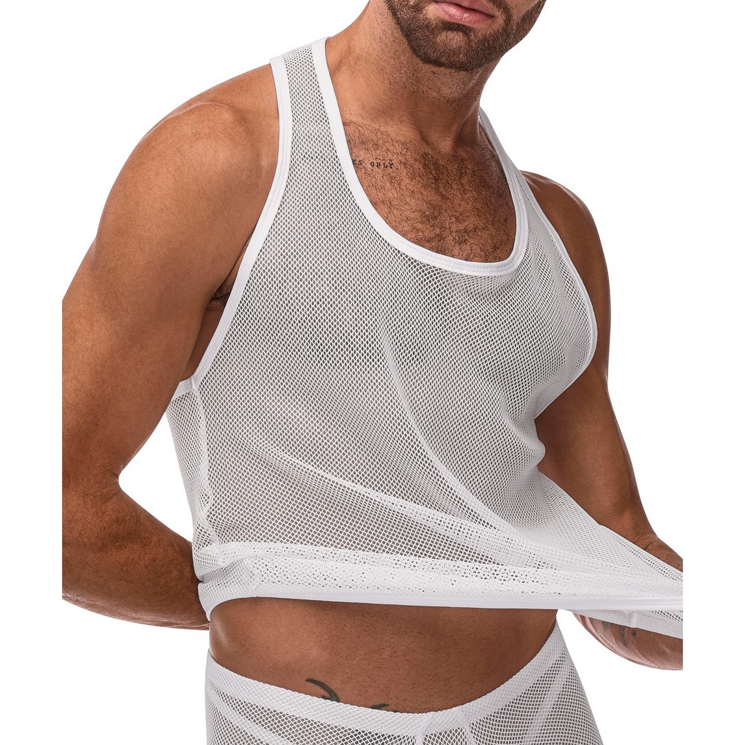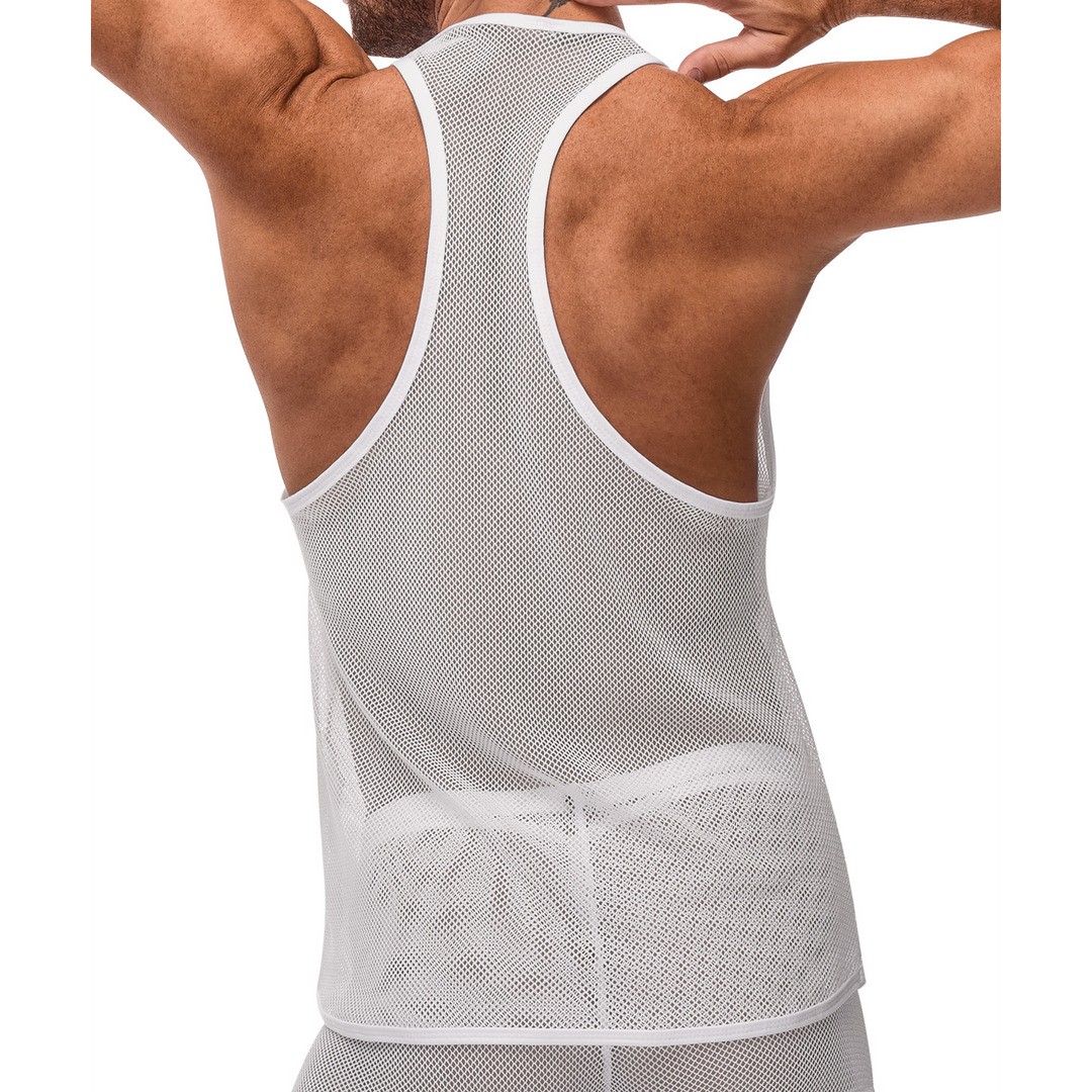 De la colección Stretch Net de Male Power, este modelo presenta un top tank de red elástica con corte en la espalda y un acabado suave y elástico a juego. Su confección en red ofrece transpirabilidad y comodidad, envolviendo el cuerpo de forma natural. Transparente y provocativo, este diseño destaca la sensualidad masculina con elegancia y atrevimiento.