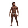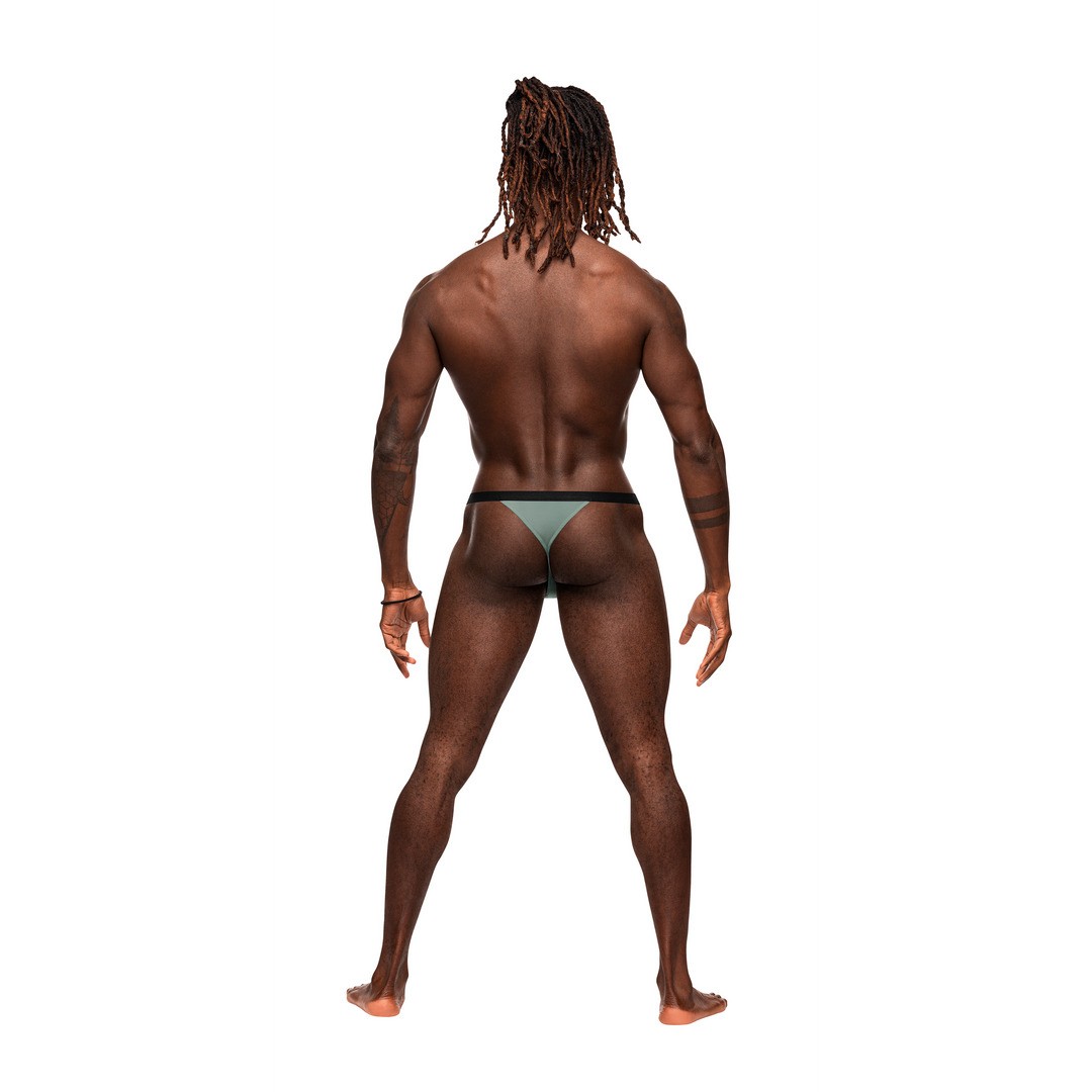 De la colección Male Power Magnificence, este modelo incluye un micro tanga en V con una ventana recortada en la cintura, ojales metálicos decorativos y una fina cinturilla elástica de felpa que se mantiene en su sitio, con una inserción de tela en forma de V en la espalda.