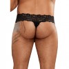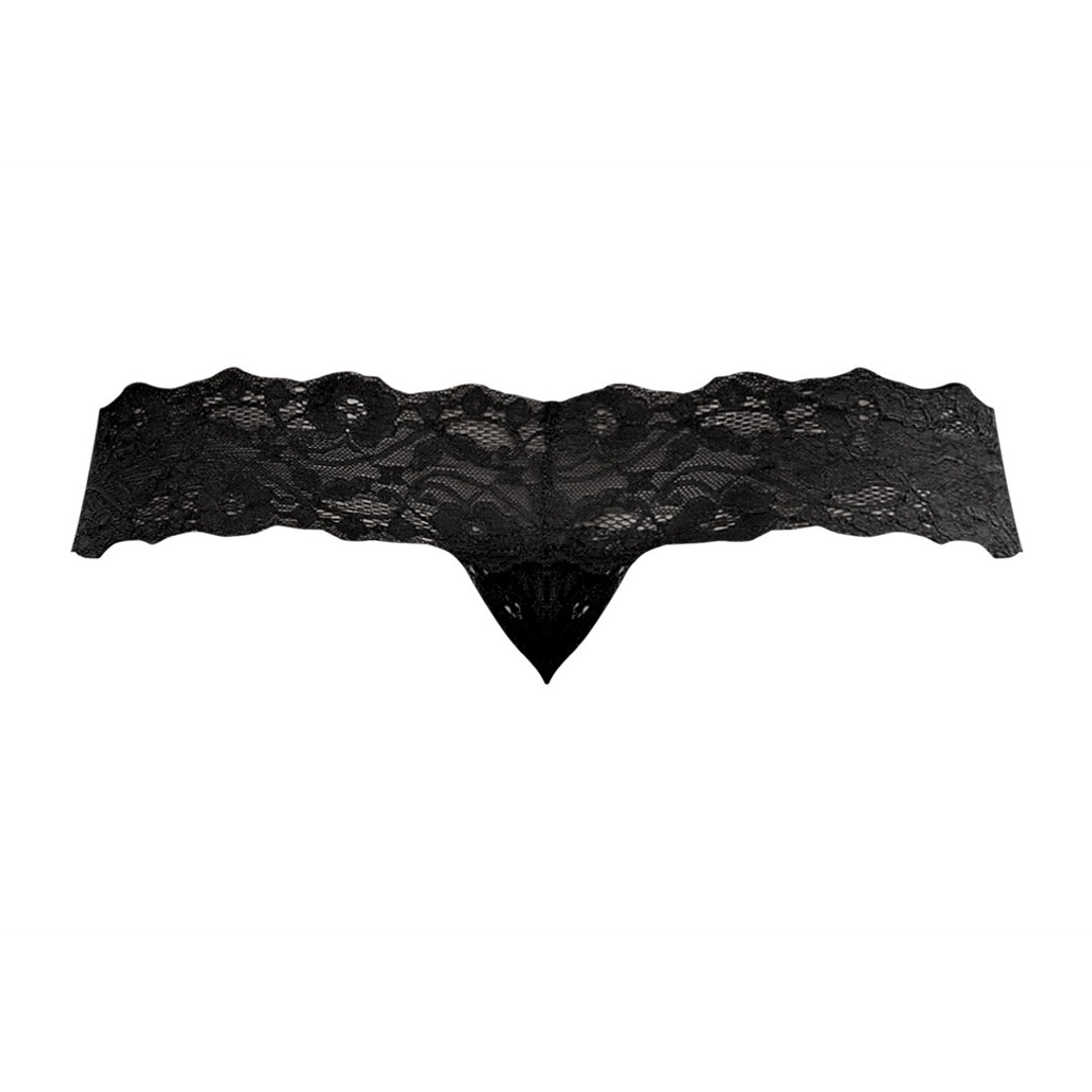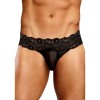 De la colección Scandal-Lace de Male Power, este estilo incluye: Un micro tanga que presenta una bolsa de malla con ribete de cire, cintura de encaje floral grueso y espalda de tanga de encaje pellizcado.