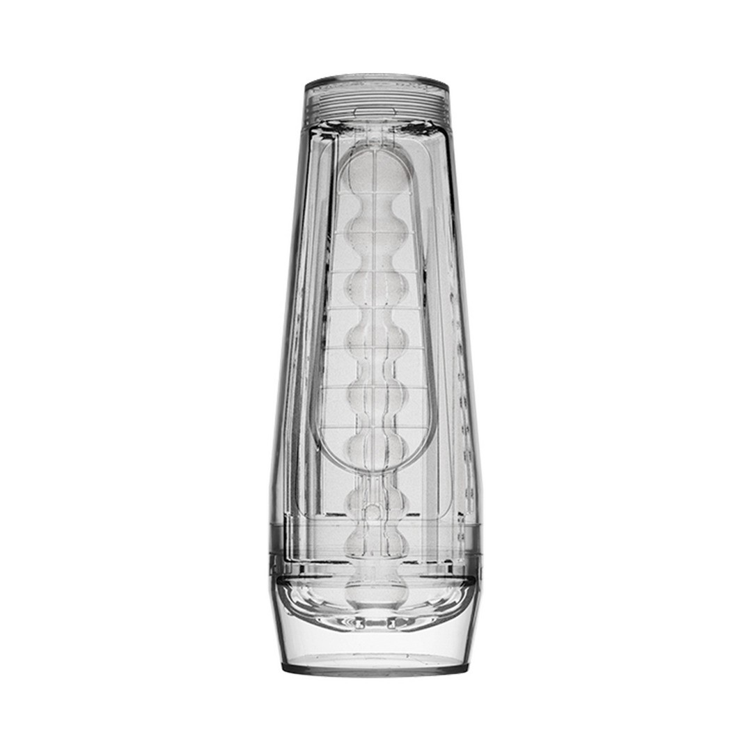Masturbador Main Squeeze Optix transparente en ULTRASKYN, con presión y succión ajustables y funda rígida discreta.