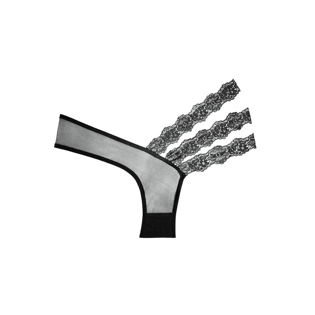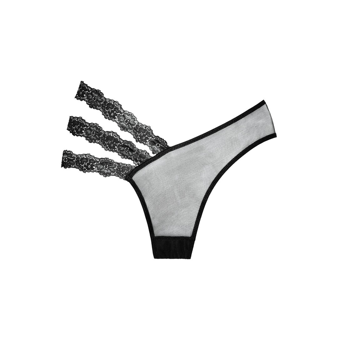 Braguita transparente asimétrica con bandas laterales de encaje triple en flor.