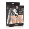 El montaje es sencillo: basta con lubricar ligeramente, colocar el anillo esférico sobre los testículos, introducir el pene y aplicar la tapa elegida antes de cerrar con el cierre. El conjunto incluye dos llaves: una para que la utilice el dominador o la dominadora y otra que se guarda como reserva de seguridad.