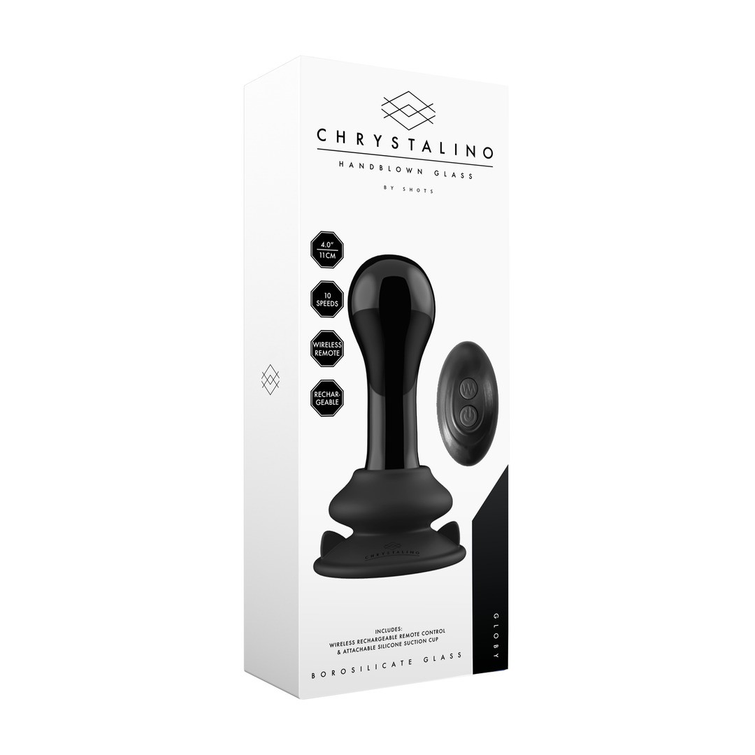 Este potente plug anal de cristal de Chrystalino, con 10 modos de vibración, está fabricado en vidrio borosilicato negro, no poroso, de alta calidad, seguro para el cuerpo, irrompible y sostenible. Ideal para juegos con temperatura, se puede calentar en agua caliente o enfriar en la nevera para una estimulación aún más intensa.