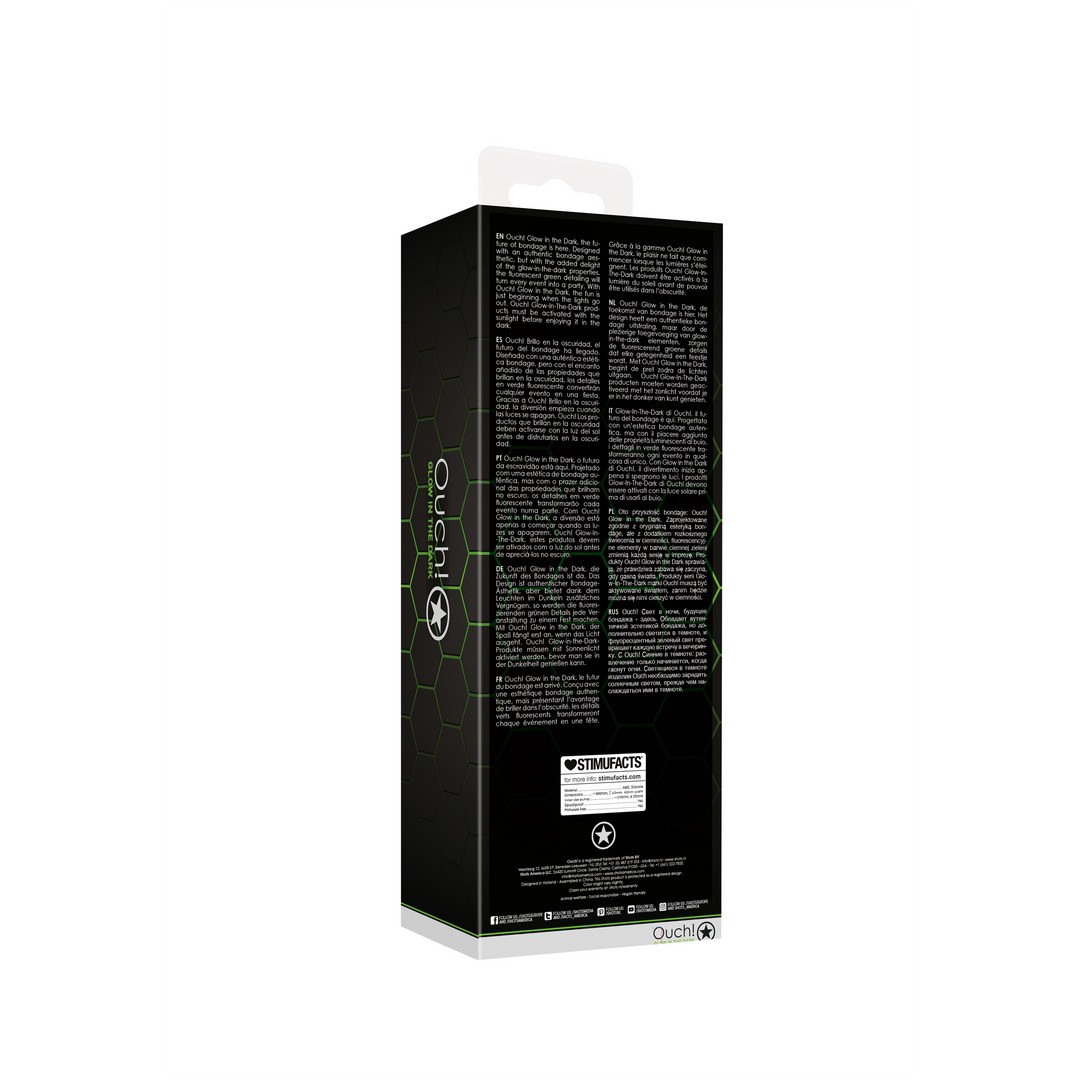 Ouch! Glow in the Dark: el futuro del bondage ha llegado. Diseñado con una estética bondage auténtica y con el placer adicional de sus propiedades que brillan en la oscuridad, los detalles fluorescentes en verde convierten cada sesión en una experiencia única.