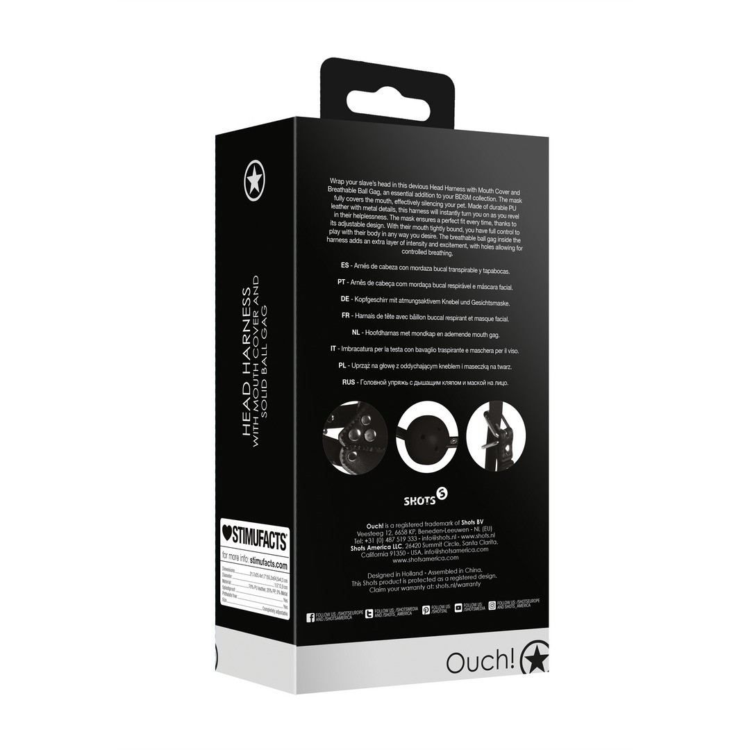 Envuelve la cabeza de tu esclavo con este arnés facial con antifaz y mordaza de bola respirable, un complemento esencial para tu colección BDSM.