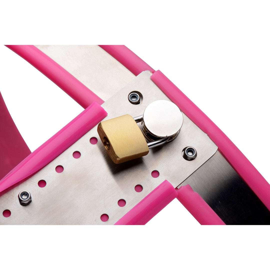 Cinturón de castidad de acero inoxidable con forro de silicona rosa, cómodo y ajustable para una sumisión segura y discreta.