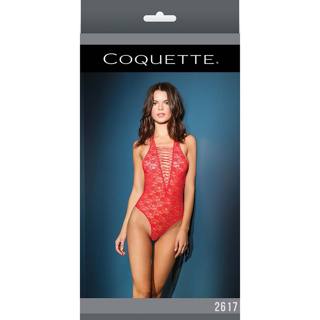 Body con escote en V en la parte delantera, confeccionado en encaje elástico con corte alto en la pierna, para un look elegante y sensual.