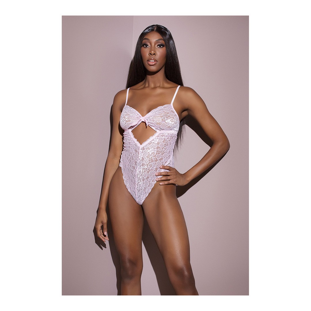 Body de encaje rosa con abertura central, que combina sensualidad y elegancia en un solo modelo.