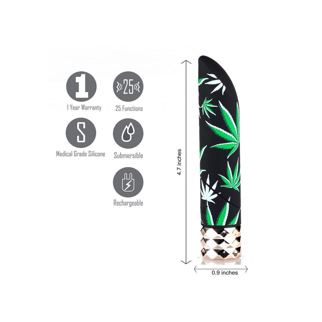Delgada y potente bala vibradora con 25 funciones y una base brillante para un placer preciso y lujoso.