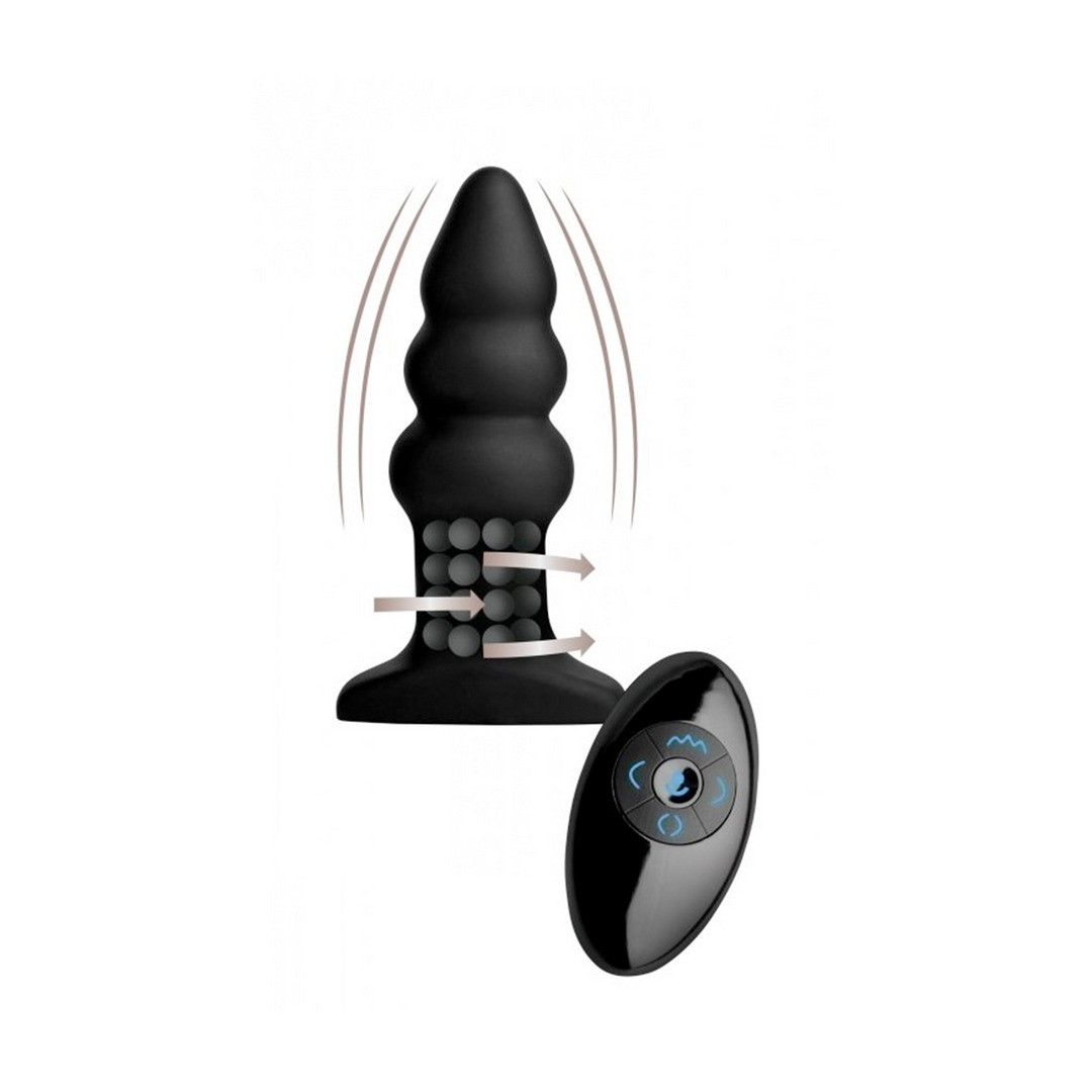 Plug anal con bulbos, vibración y perlas giratorias, ideal para un placer creciente y una estimulación intensa con control remoto.