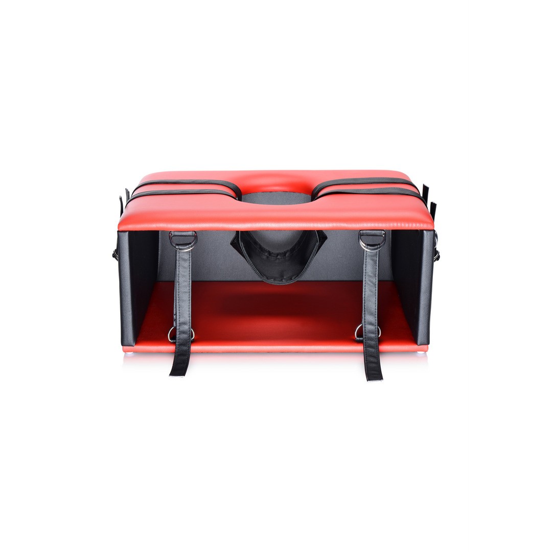 El asiento cuenta con un cojín mullido con una abertura donde se puede colocar la cabeza. Con las esposas y los anillos incluidos, es posible colocar a la pareja en la postura perfecta.