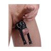 Extensor de testículos con correa y anillos para tirar, humillar y dominar con precisión.