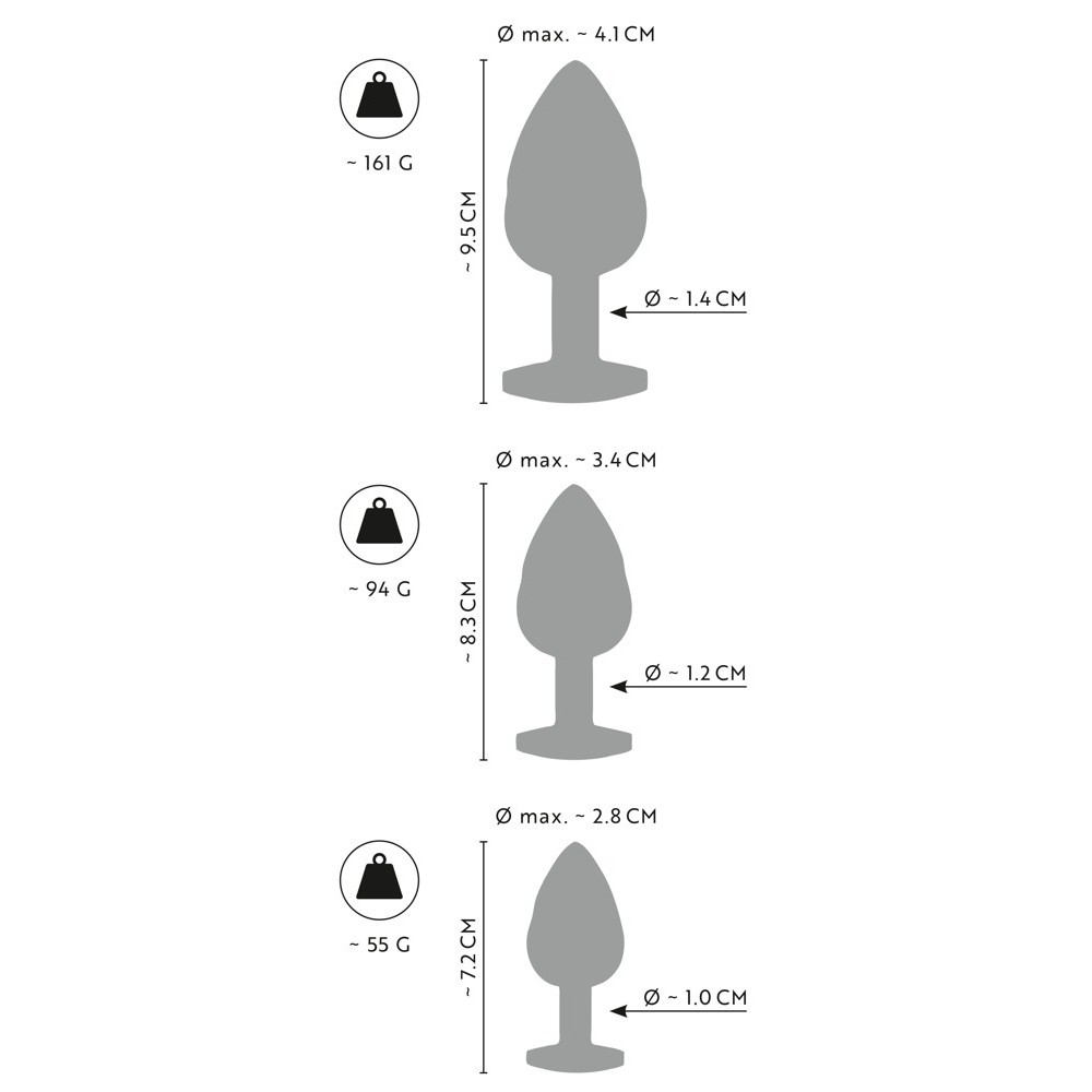 El conjunto de plugs anales metálicos con diamantes de ANOS incluye 3 plugs de metal de diferentes tamaños y pesos, ideales para la estimulación anal y el entrenamiento progresivo de estiramiento. Cada plug presenta una gema brillante de diferente color en la base de seguridad, lo que añade un toque decorativo y elegante al ano.