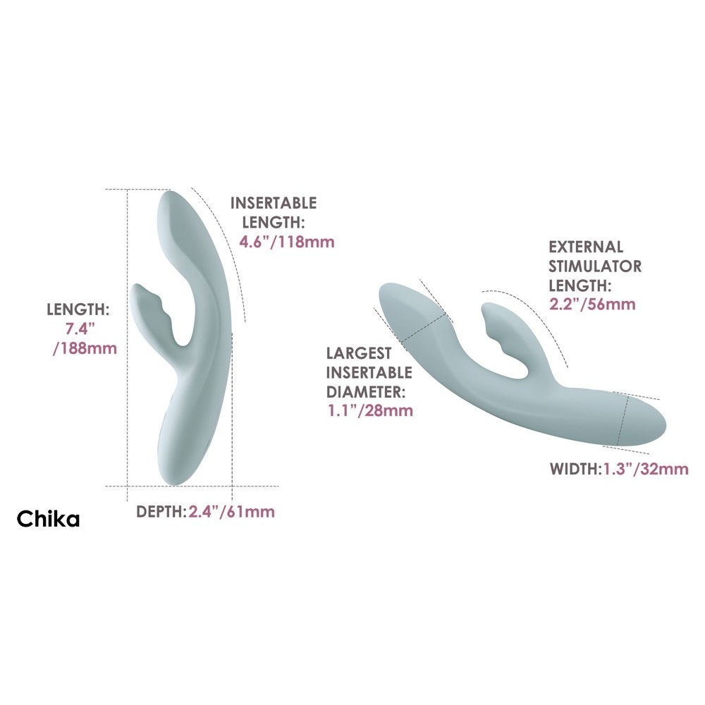 El Chika está hecho de silicona líquida aterciopelada y suave, lo que significa que es agradablemente firme pero también maravillosamente flexible. Se adapta perfectamente al cuerpo y a sus movimientos. Es fácil de insertar y muy cómodo durante el placer, gracias a su superficie extremadamente suave.