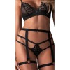 El conjunto negro transparente de 3 piezas, Blomentis de Obsessive, contiene un sujetador sin aros, un liguero y un tanga. El sujetador y el tanga están hechos de precioso encaje y delicado tul elástico. Hay un pequeño lazo entre las copas inalámbricas. Los tirantes del sujetador se pueden ajustar. El tanga tiene una elegante cinturilla doble. El liguero tiene anillas y suaves tiras elásticas. Los tirantes del liguero y las tiras de los muslos se pueden ajustar. Hay un pequeño detalle decorativo en la parte delantera de la cinturilla.