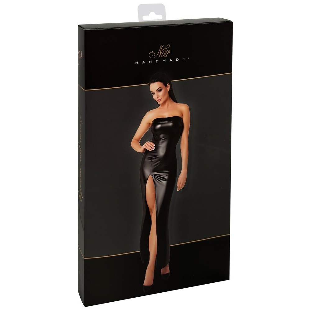 El vestido largo y favorecedor de Noir está confeccionado en un bonito tejido negro con efecto wetlook. Es suave y elástico para un ajuste ceñido a la piel, pero muy cómodo. No tiene tirantes y se mantiene en su sitio gracias al amplio escote elástico. Con una gran abertura en la parte delantera. Con cremallera en la espalda.