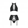 Compuesto por tres piezas irresistibles, incluye un top que se abrocha alrededor del cuello, un liguero y un tanga de corte atrevido, todo en piel negra de alta calidad.
