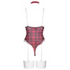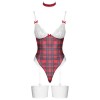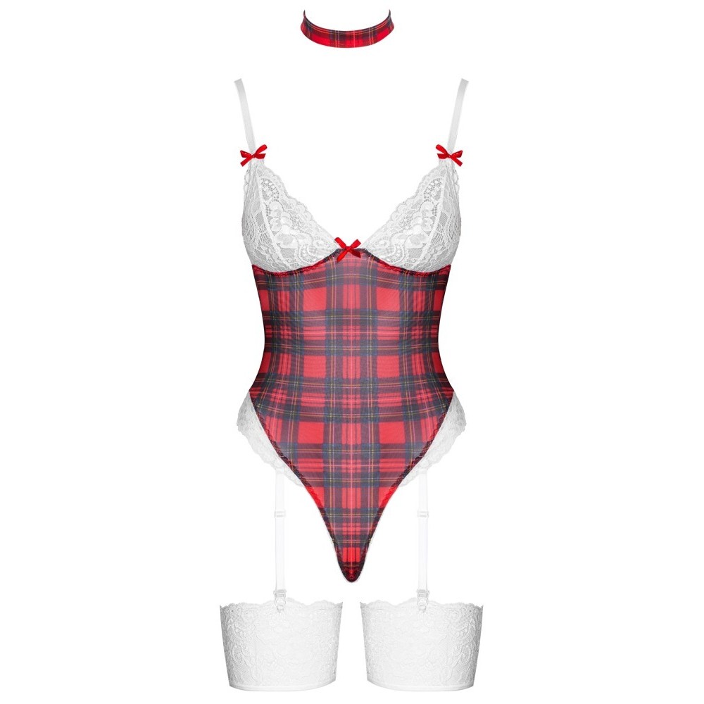 El descarado conjunto de lencería de Cottelli LINGERIE contiene un body de tirantes y una gargantilla. El body es de cuadros escoceses y tiene copas de encaje blanco sin aros y pequeños lazos rojos decorativos. El body tiene un diseño de tanga con agujeros muy altos en las piernas que llevan encaje blanco decorativo alrededor. Los tirantes blancos tienen ligueros anchos y elásticos de encaje. Los tirantes se pueden ajustar y quitar. Los tirantes del sujetador se pueden ajustar. También hay un práctico cierre de gancho en la zona de la entrepierna. La gargantilla estrecha también tiene un diseño a cuadros y se puede ajustar con el cierre de velcro.