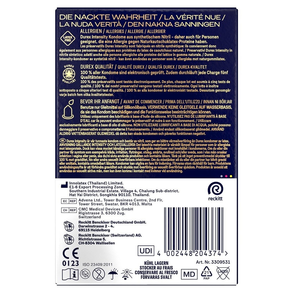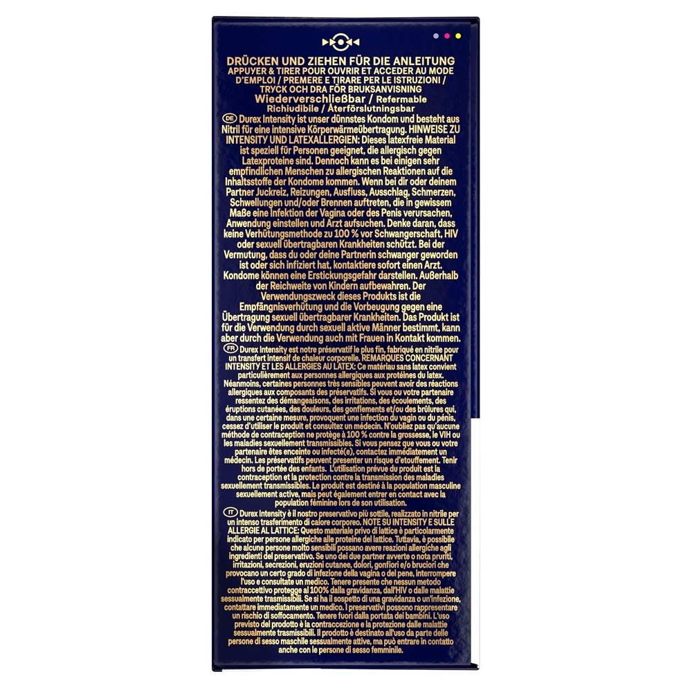 Los preservativos Durex Intensity, ultrafinos y sin látex, están fabricados con nitrilo, por lo que proporcionan una intensa transferencia de calor corporal y ofrecen una sensación tan natural que casi parece que no llevas nada puesto, como si sólo estuvieras sintiendo a tu pareja. Están generosamente lubricados con un lubricante a base de silicona.