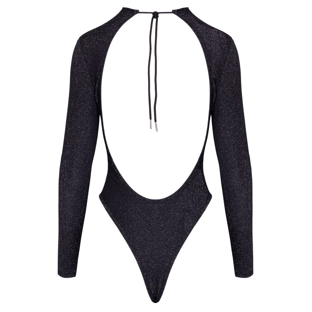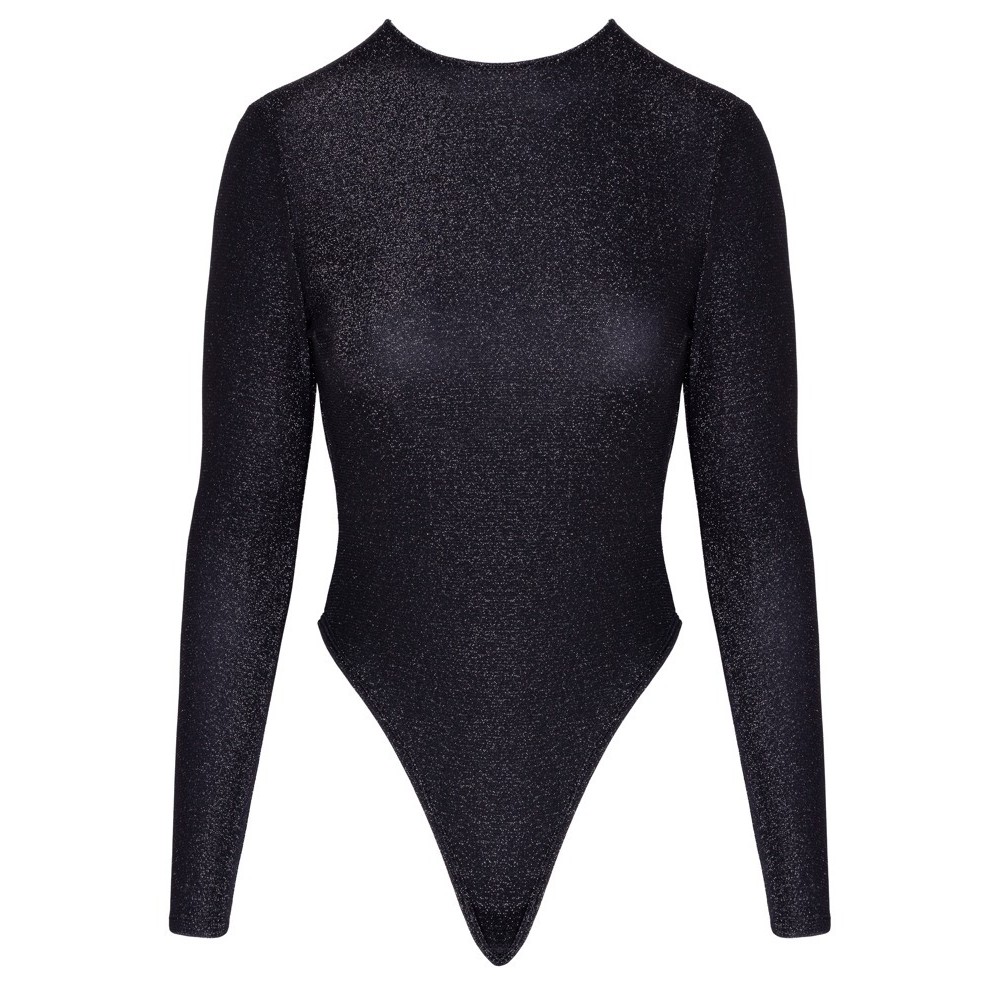 El body tanga de manga larga de Cottelli PARTY está confeccionado en tejido negro con detalles plateados brillantes integrados. Es suave y elástico, lo que lo hace muy cómodo de llevar. Es deslumbrante, ya que no tiene espalda y cuenta con un cordón en la parte posterior del cuello con un cierre ajustable. El estilo tanga le da un aspecto de pierna alta, que realza las piernas y las nalgas de una manera deslumbrante. Tiene un práctico cierre de gancho en la zona de la entrepierna.