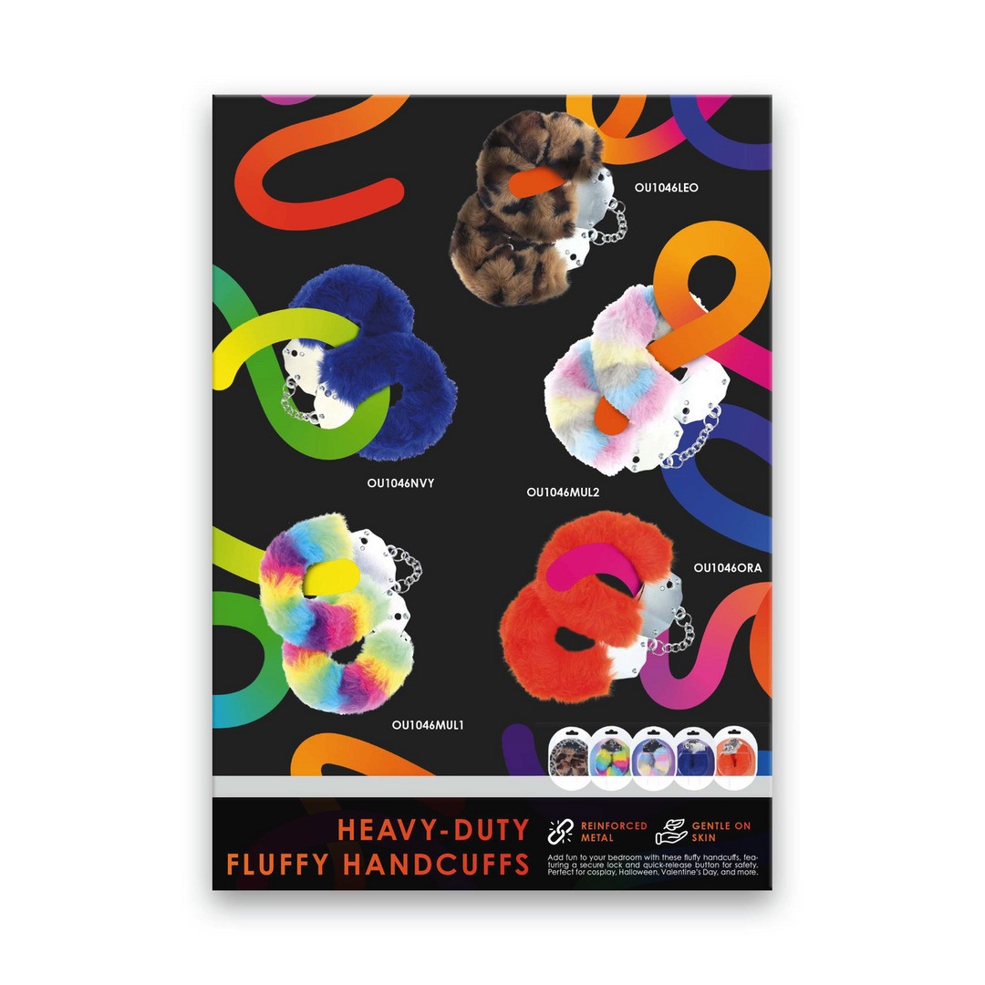 Infografía Heavy-dutty fluffy handcuffs (OU1046LEO - OU1046NVY - OU1046MUL2 - OU1046ORA - OU1046MUL1) en inglés.